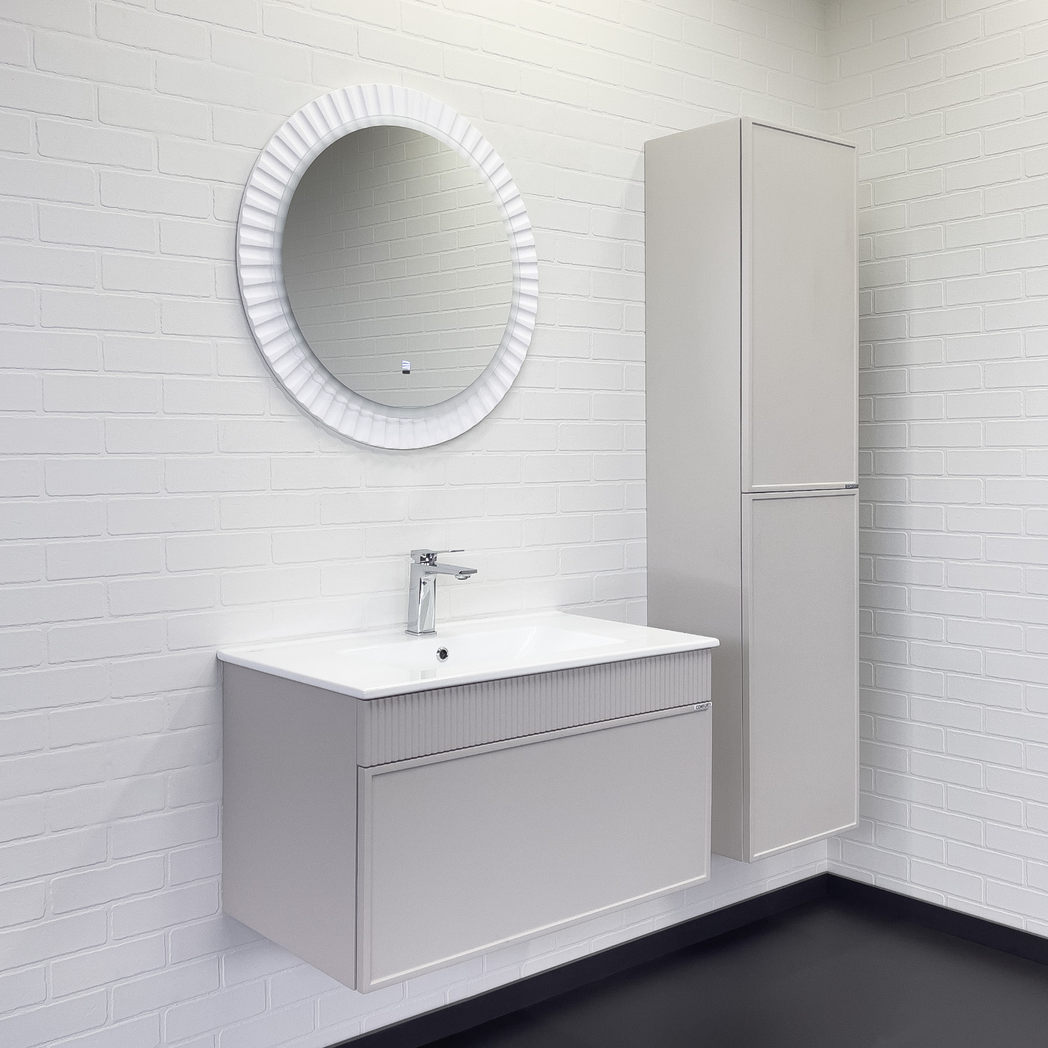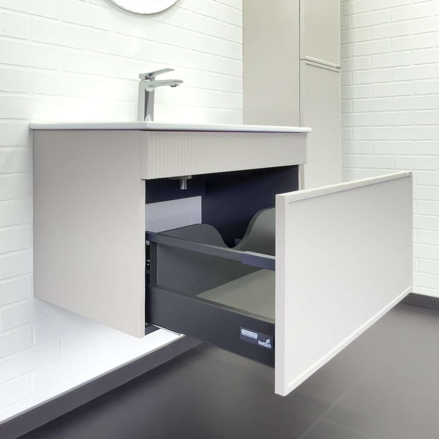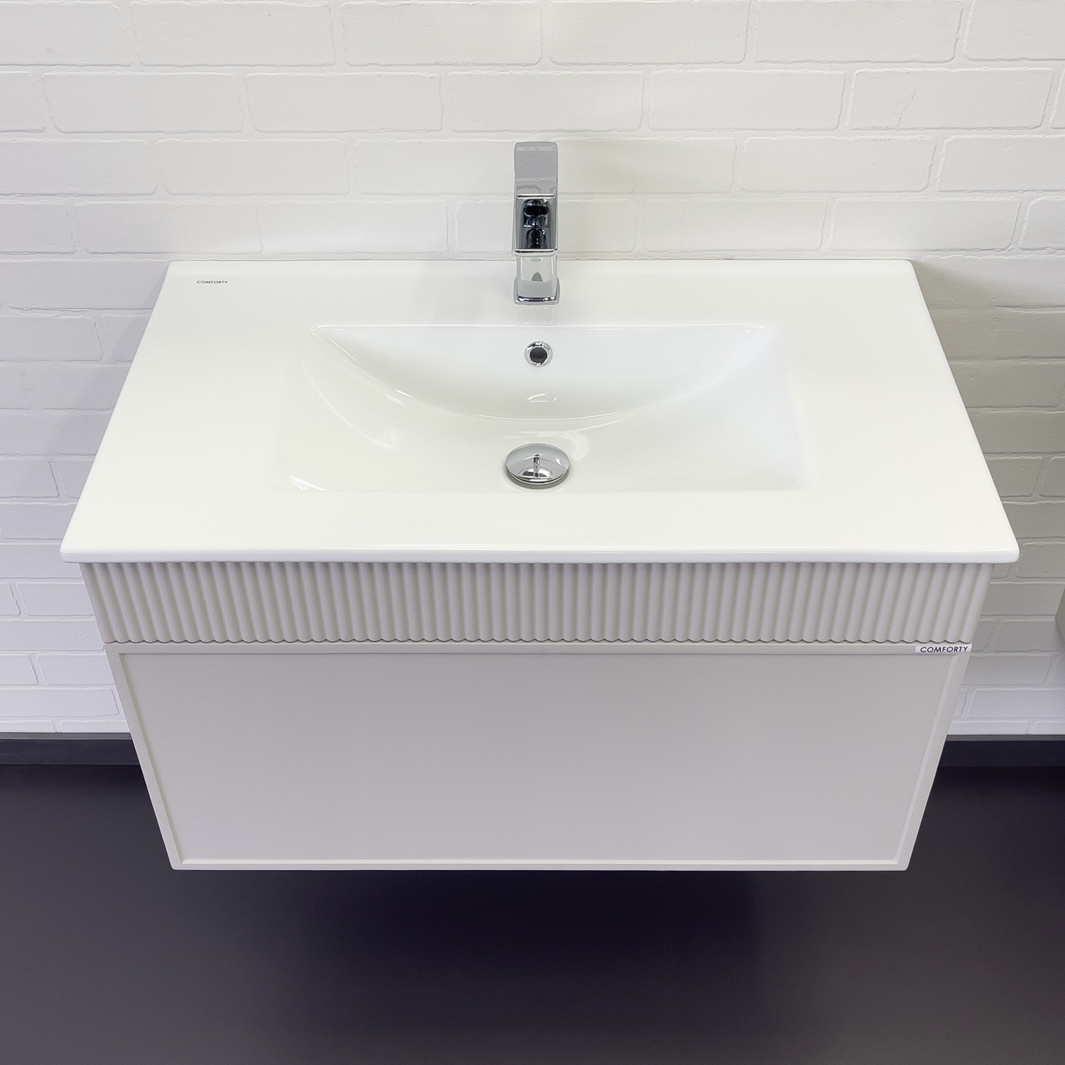 Материал корпуса: влагостойкое ЛДСП Материал фасада: МДФ Габариты (ШхВхГ): 810*465*465 мм Комплектация: керамическая раковина Comforty 80E Подвесная тумба с одним большим выкатным ящиком оборудованным направляющими с системой плавного закрывания. Корпус тумбы изготовлены из влагостойкого ЛДСП. Фасад тумбы из МДФ фрезерован кантом по периметру. Подпорная царга фрезерована вертикальным узором. Корпус и фасад тумбы затянуты в матовую пленку цвета "серый шёлк". Тумба подготовлена для подключения водоснабжения снизу и сзади.