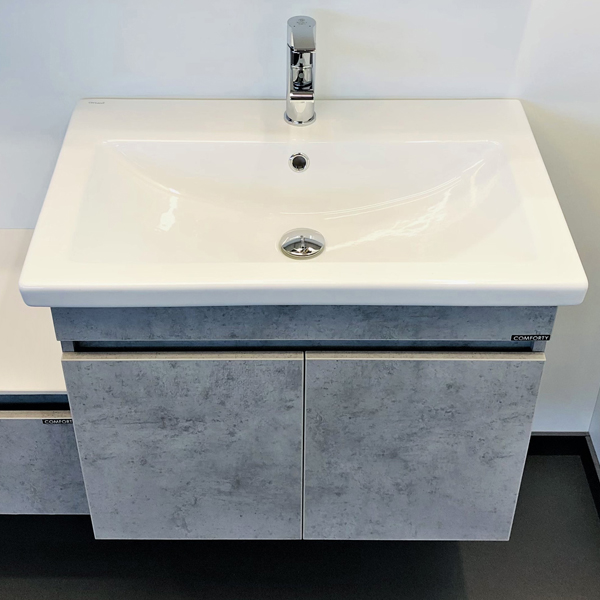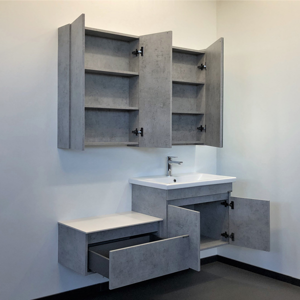 Подвесная тумба-умывальник с двумя распашными створками. Петли створок оснащены механизмами плавного закрывания. Тумба подготовлена для подключения водоснабжения снизу.