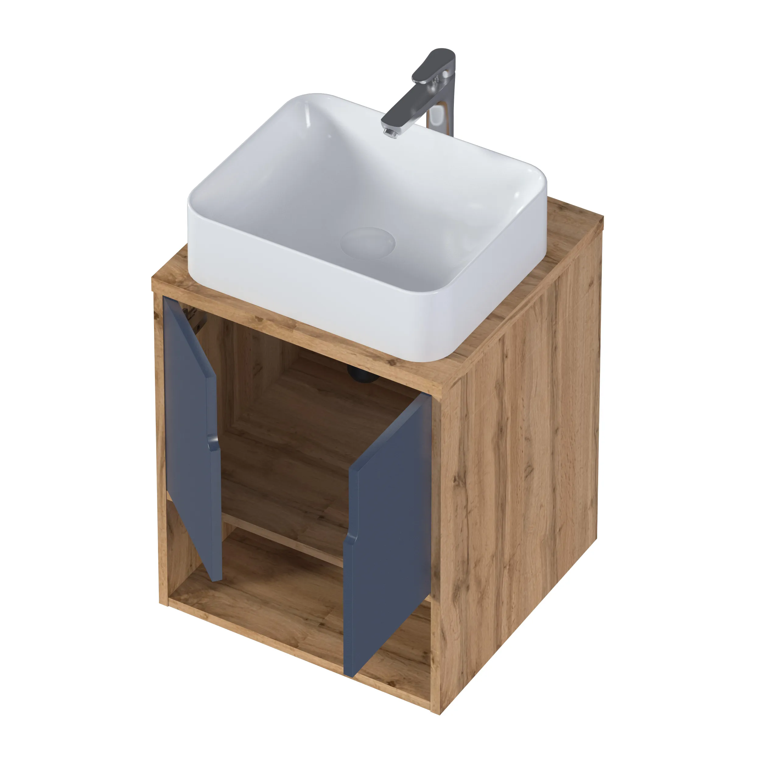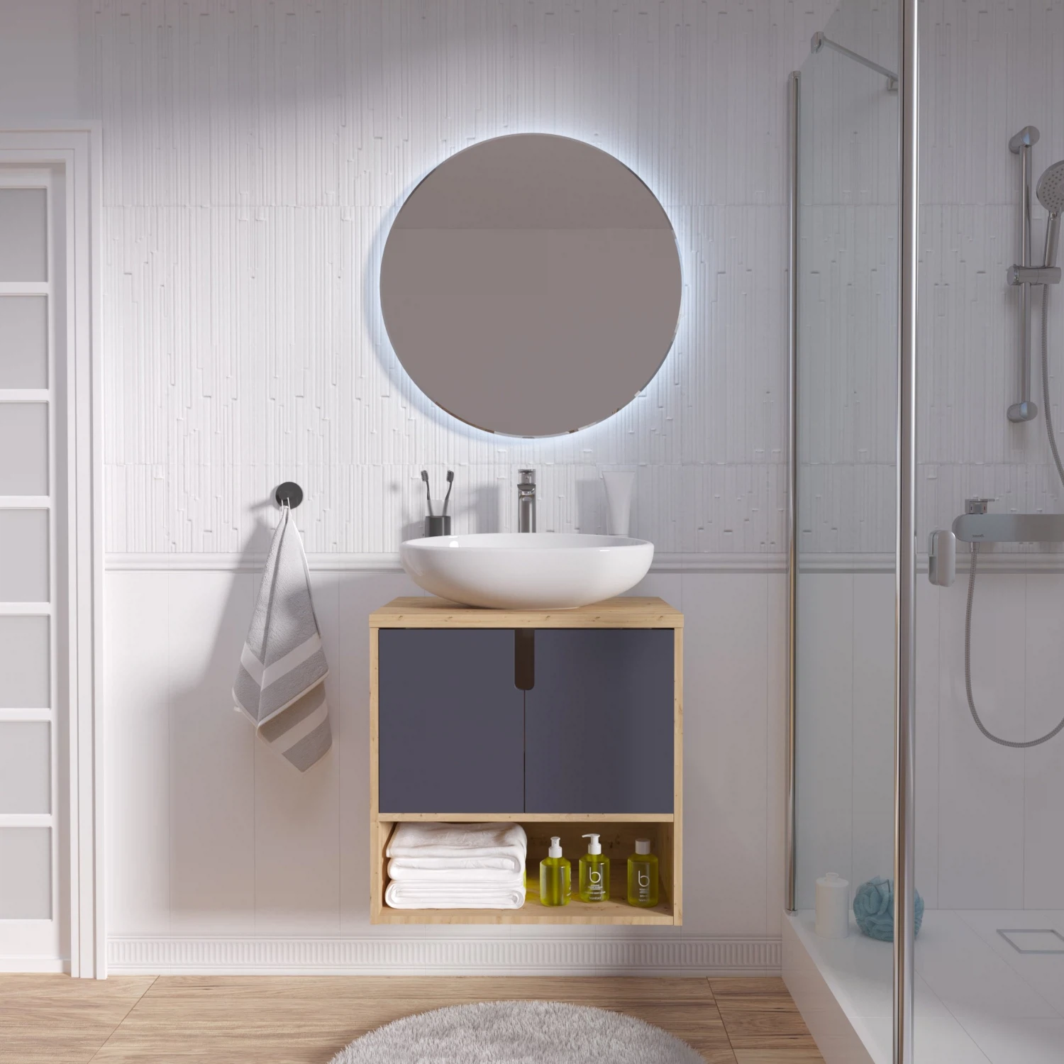 Подвесная тумба под накладную раковину с синим фасадом — удивительное решение для ванной со своей философией. Темно-синий оттенок фасада отражает глубину чувств, мыслей и эмоций. Такой цвет в сочетании с теплым древесным корпусом создает атмосферу внутреннего спокойствия, отдыха и самопознания.