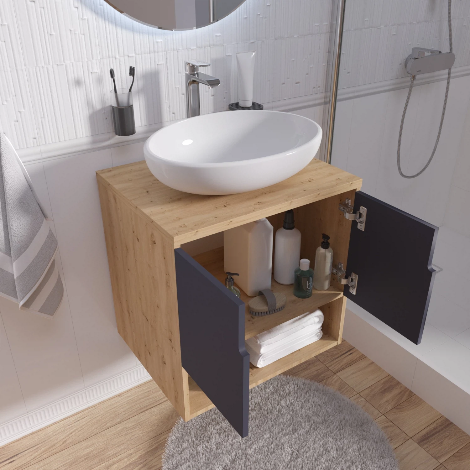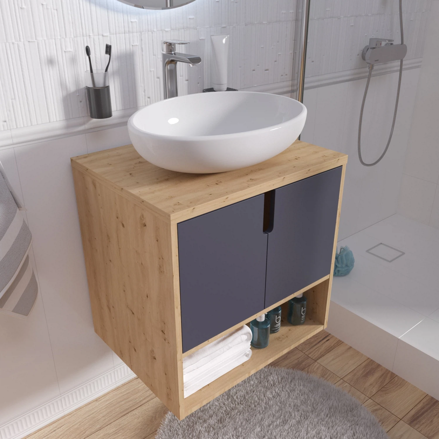 Подвесная тумба под накладную раковину с синим фасадом — удивительное решение для ванной со своей философией. Темно-синий оттенок фасада отражает глубину чувств, мыслей и эмоций. Такой цвет в сочетании с теплым древесным корпусом создает атмосферу внутреннего спокойствия, отдыха и самопознания.