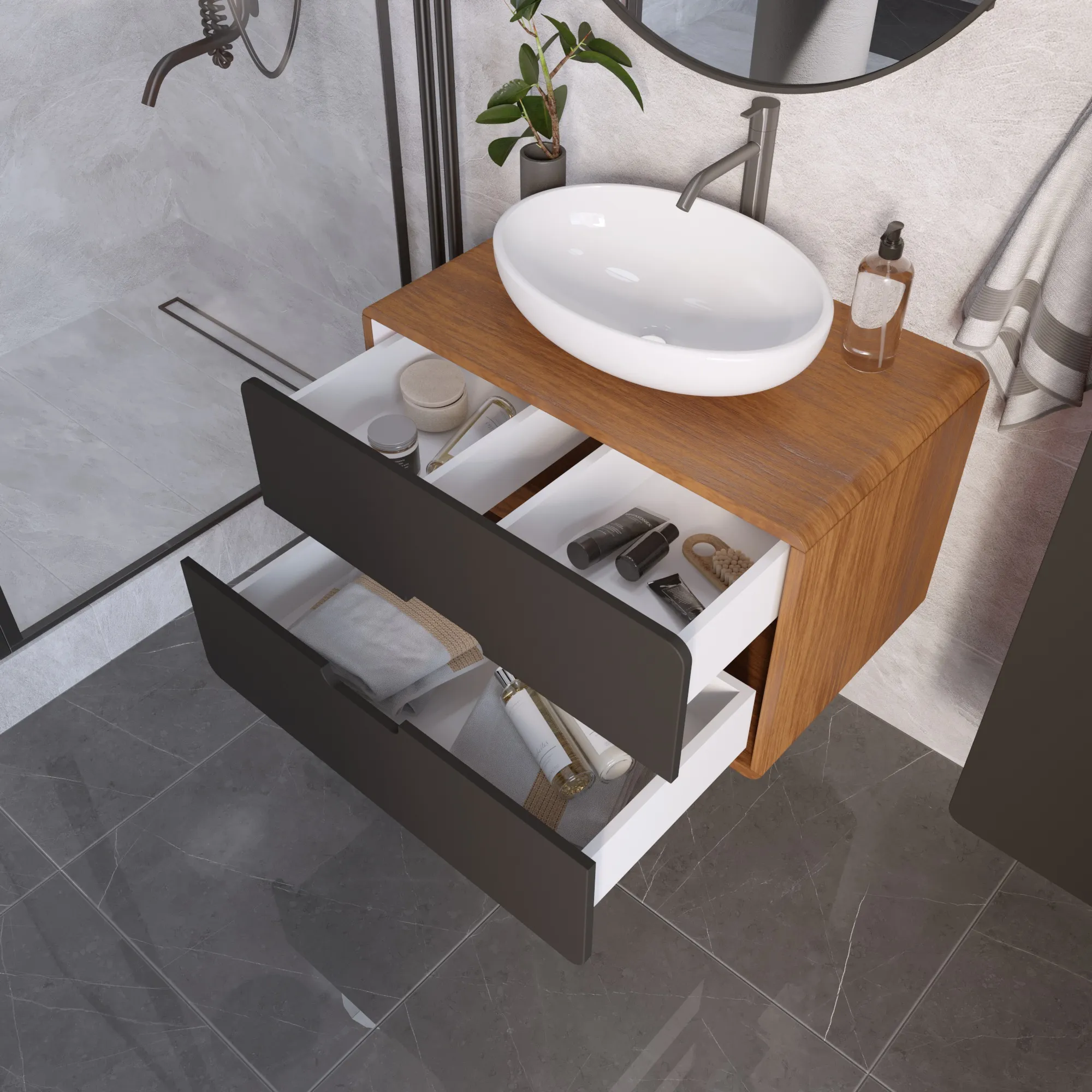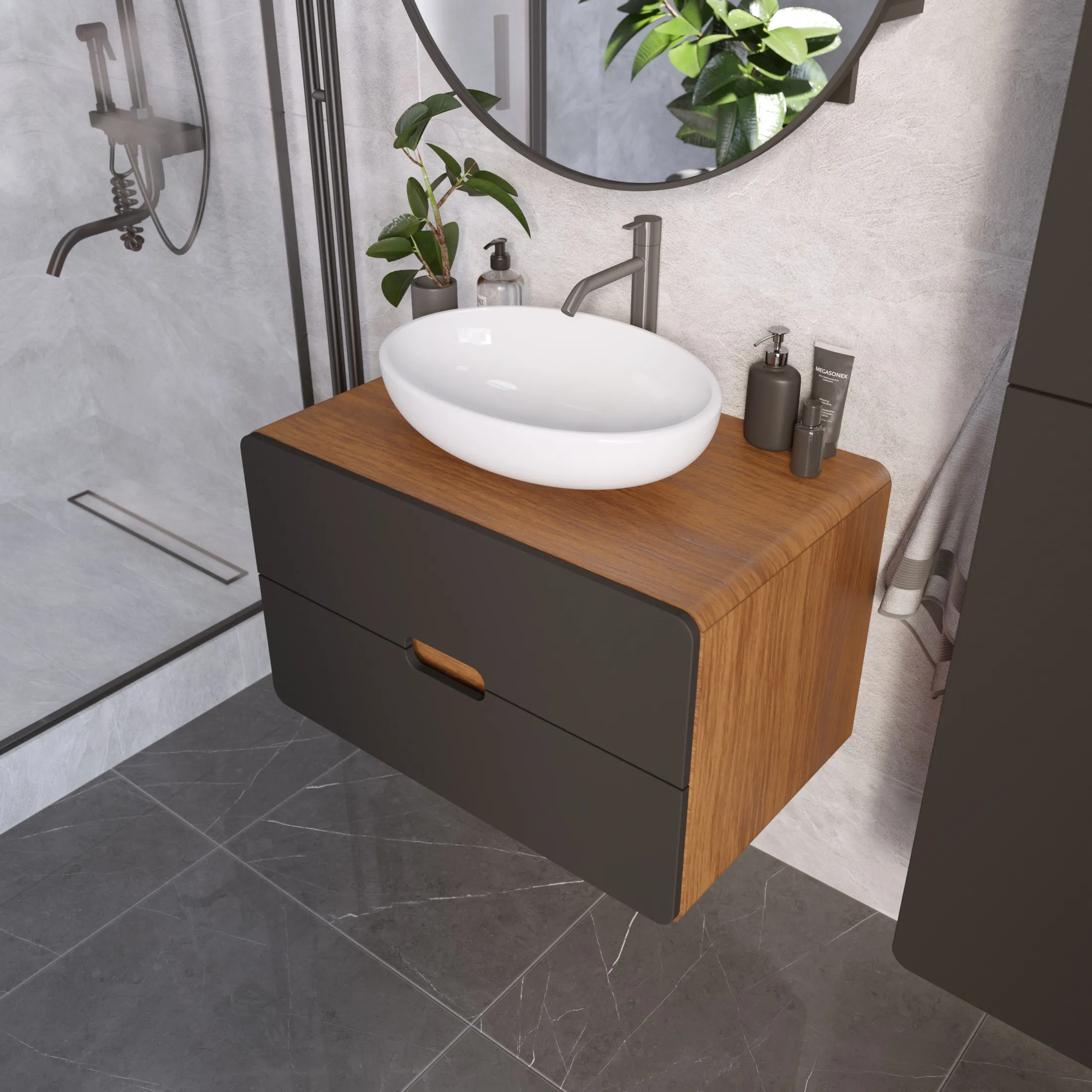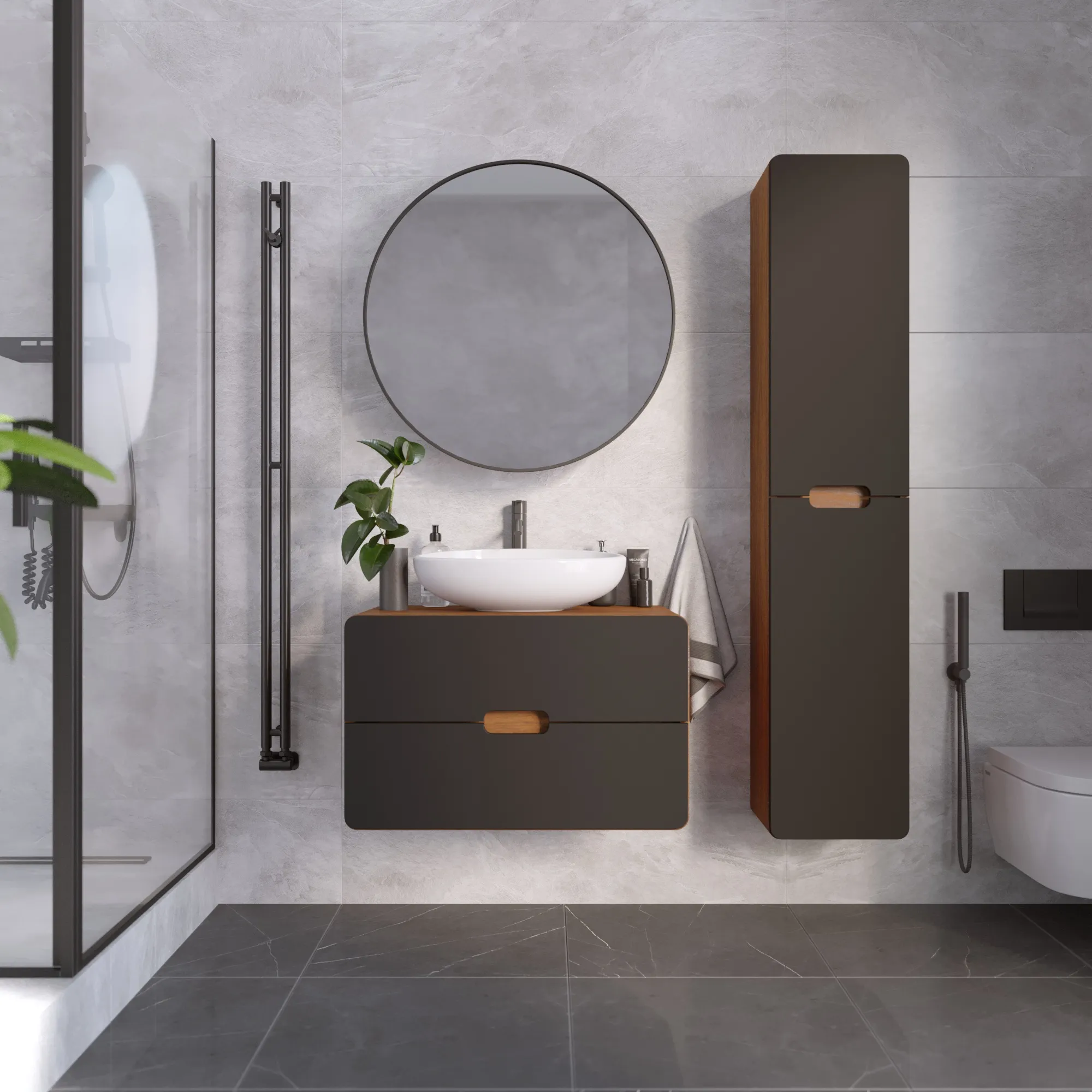 Черная подвесная тумба под накладную раковину – современное минималистичное решение для ванной. Плавные скругленные углы символизируют гармонию, создают ощущение легкости и безопасности. Это особенно актуально в ванной комнате, где важно чувствовать себя комфортно и расслабленно. Черный фасад придает мебели строгость, в то время как древесный ореховый корпус добавляет теплоты и натуральности. Такое сочетание создает контрастный и изысканный интерьер, который подчеркивает индивидуальность комнаты.