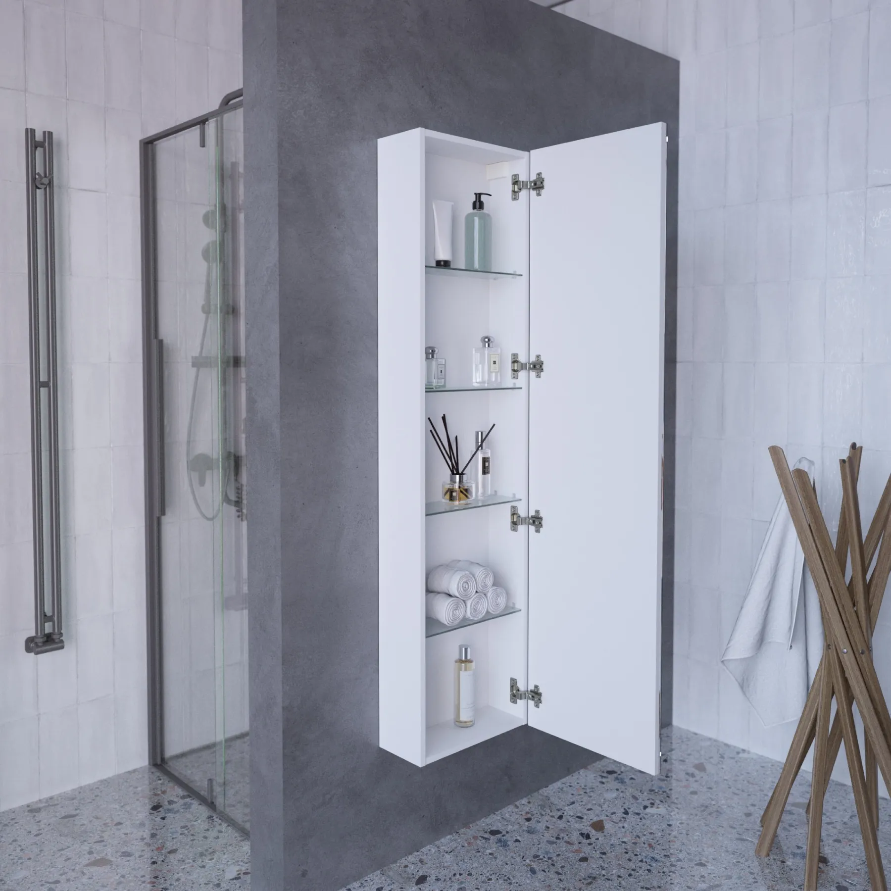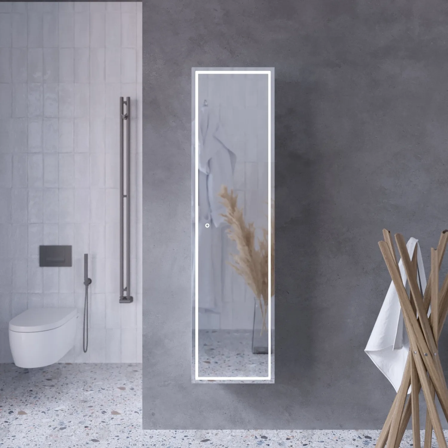 Зеркальный пенал позволяет использовать его не только для макияжа, но и для оценки своего образа перед выходом из дома. Подвесной тип монтажа визуально расширяет пространство, облегчает уборку, дает легкий доступ для робота-пылесоса.