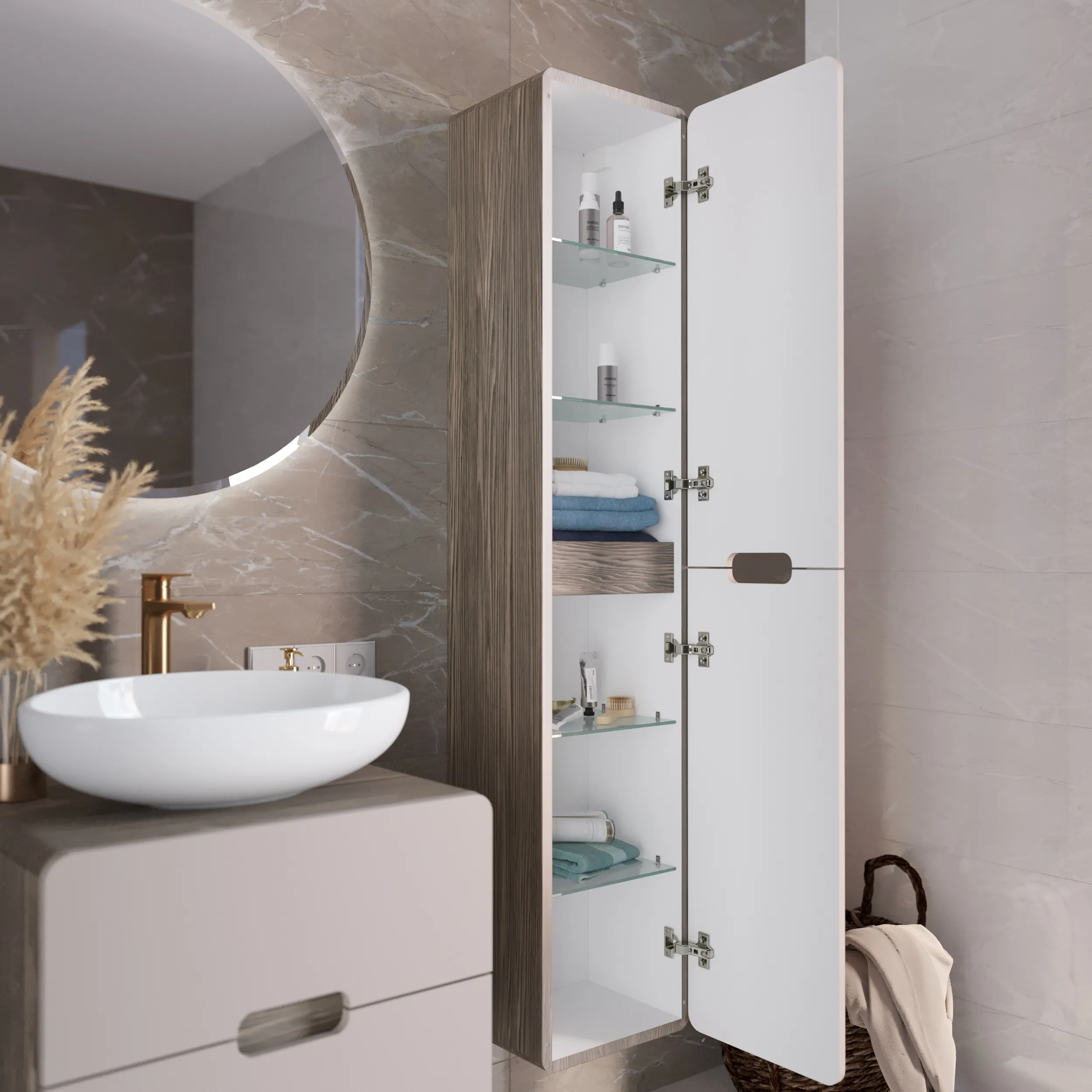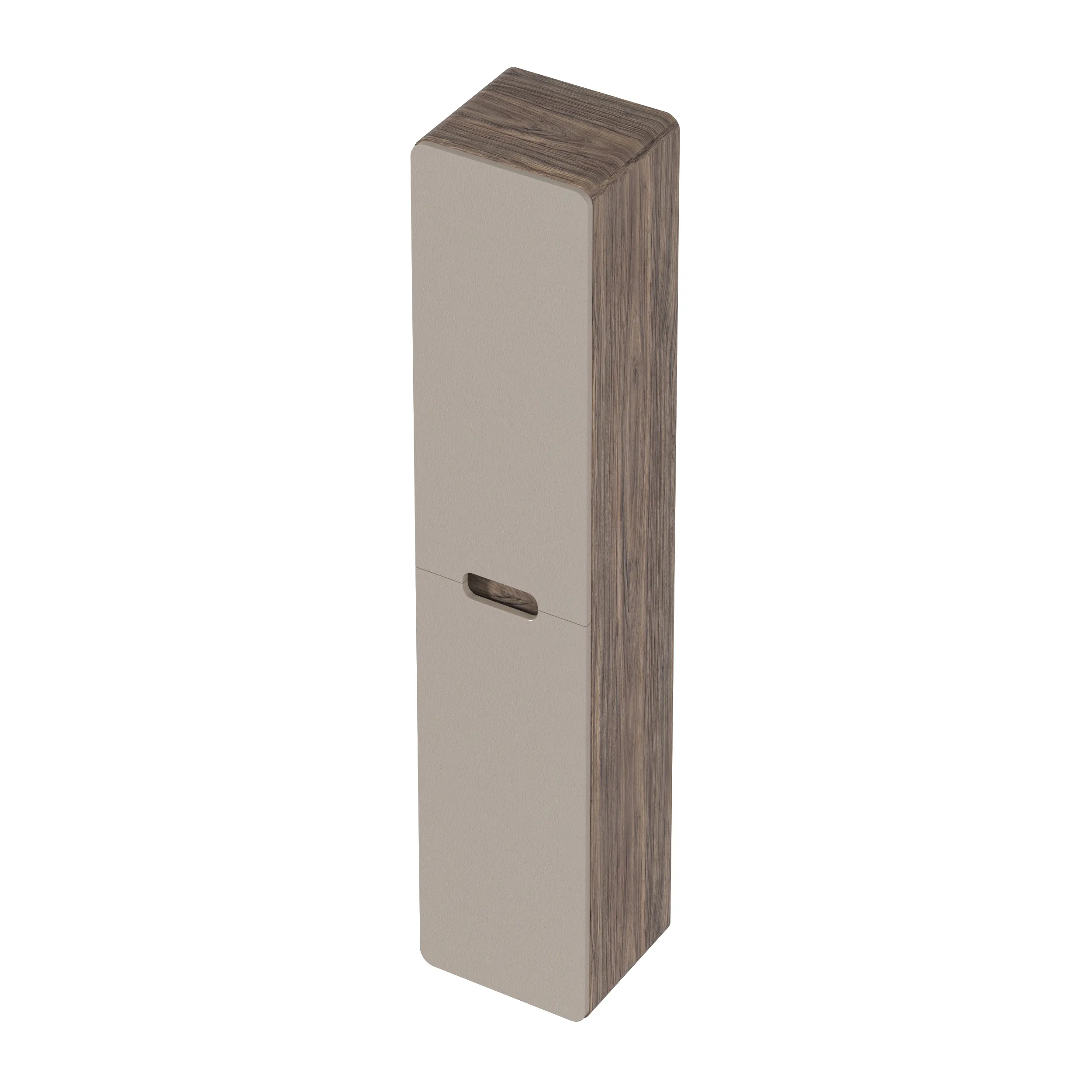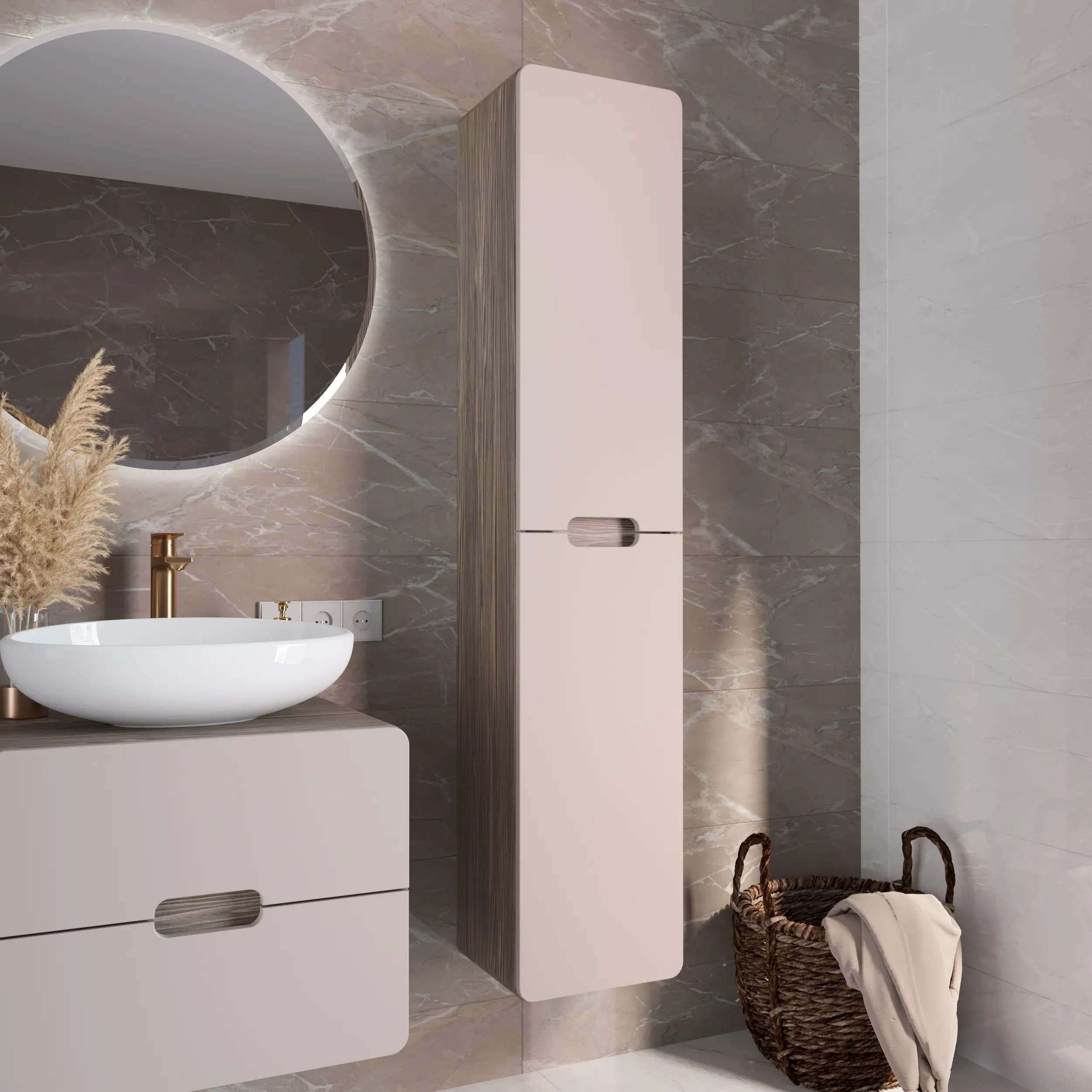 Подвесной пенал для ванной – современное минималистичное решение. Плавные скругленные углы символизируют гармонию, создают ощущение легкости и безопасности. Это особенно актуально в комнате, где важно чувствовать себя комфортно и расслабленно. Тонкие оттенки кофейного фасада и орехового древесного корпуса воплощают в себе элегантность и теплоту, их сочетание делает ванную идеальным местом для отдыха и ухода за собой.