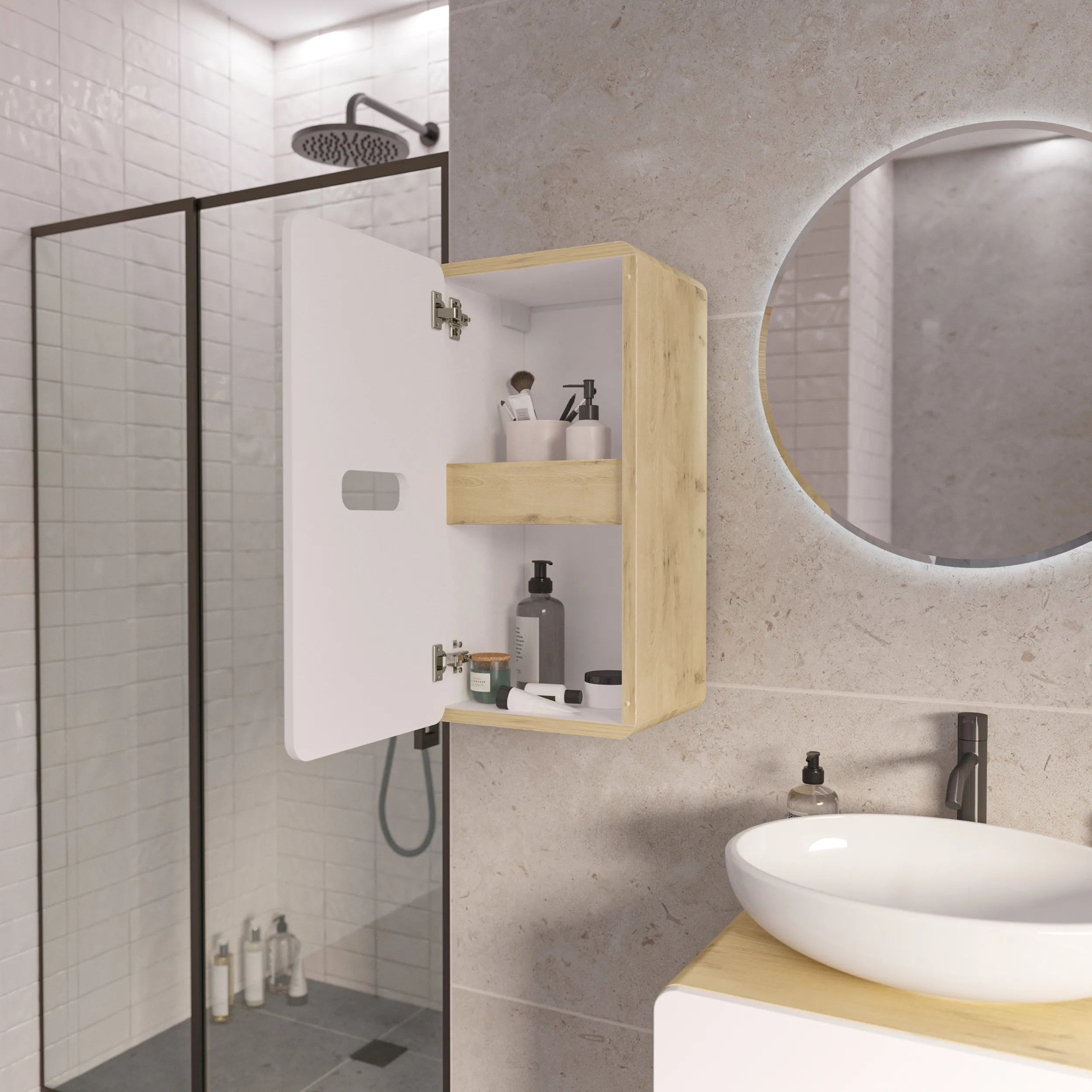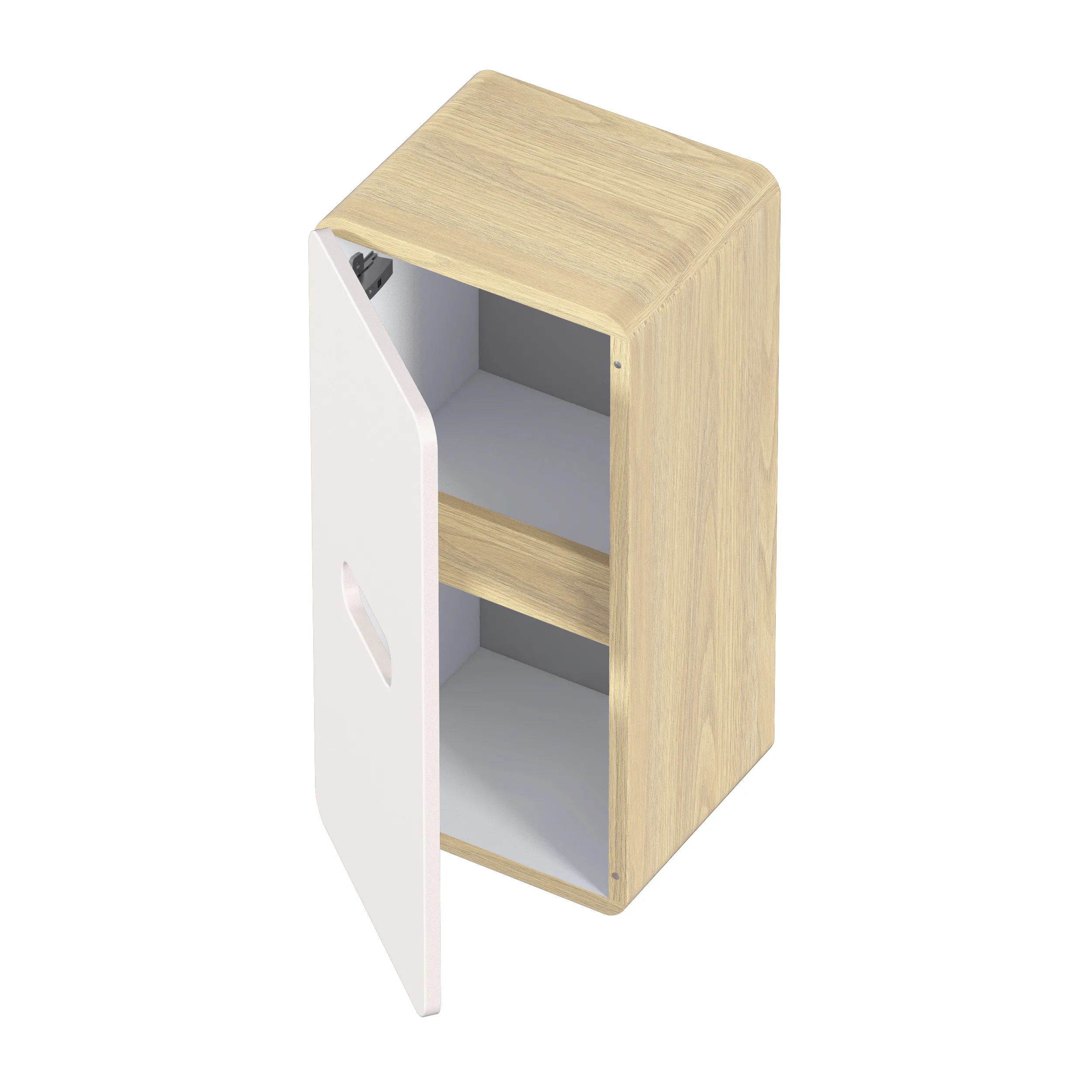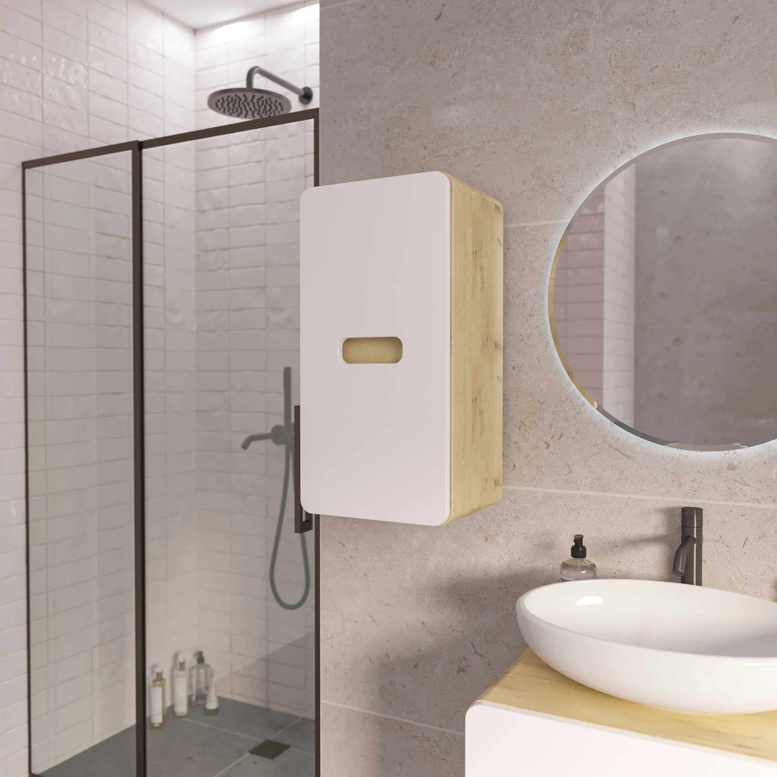 Подвесной пенал – современное минималистичное решение для хранения в ванной. Плавные скругленные края, белый фасад с древесным корпусом символизируют гармонию, создают ощущение легкости и безопасности. Это особенно актуально в ванной комнате, где важно чувствовать себя комфортно и расслабленно.
