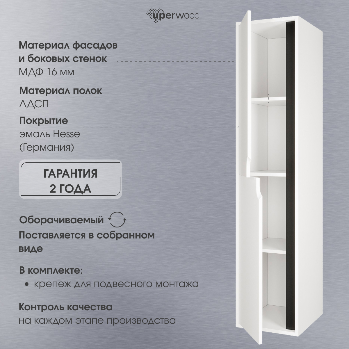 Фурнитура и доводчики премиум-класса.Шкаф-пенал поставляется в собранном виде, в комплект входит крепеж для подвесного монтажа.Настенный пенал для ванной комнаты из коллекции Uperwood Modul отлично дополнит подвесные тумбы Uperwood Modul и обеспечит еще больше вариантов хранинения для ванных принадлежностей.