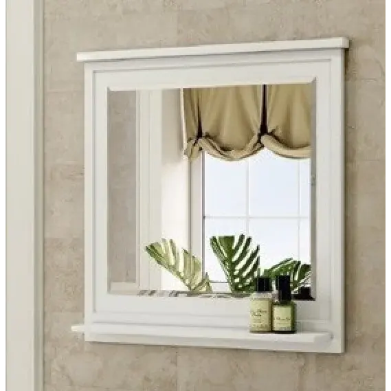 Зеркало для ванной комнаты с полочкой в обрамлении фигурной рамы из МДФ покрытого белой глянцевой эмалью. Высококачественное зеркальное полотно с амальгамой на основе серебра.