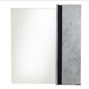 Створка оснащена профильного вертикальной металлической ручкой окрашенной в матовый черный цвет. Петли с системой плавного закрывания. Высококачественное зеркальное полотно с амальгамой на основе серебра. Фасад и корпус из влагостойкого ЛДСП Бетон светлый. За створкой две горизонтальные полки.