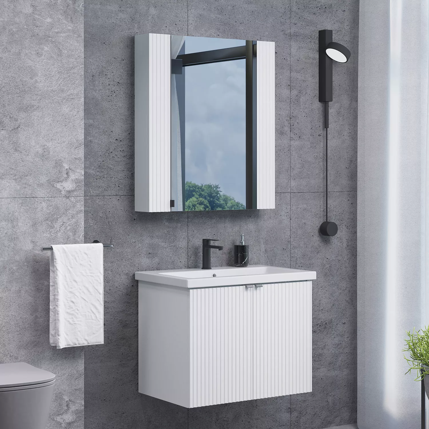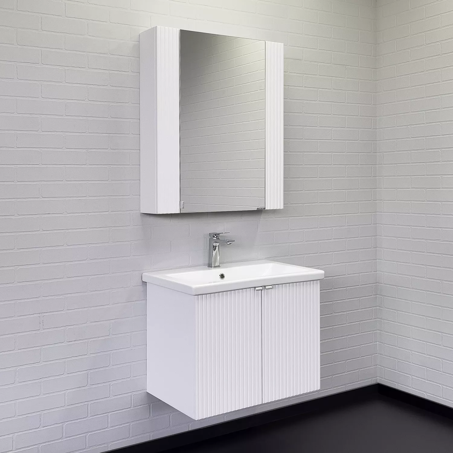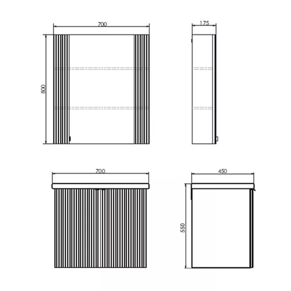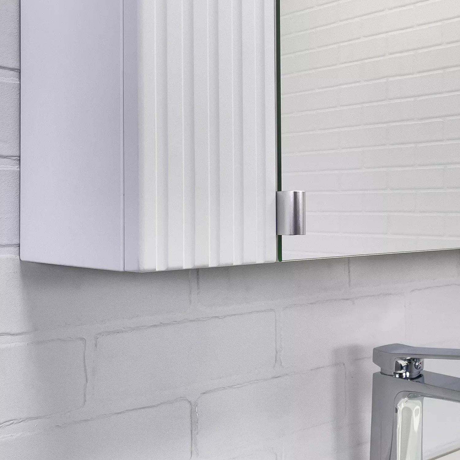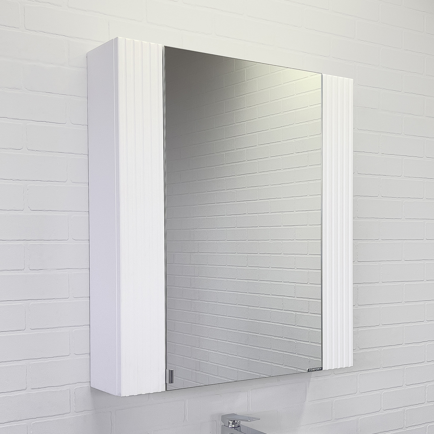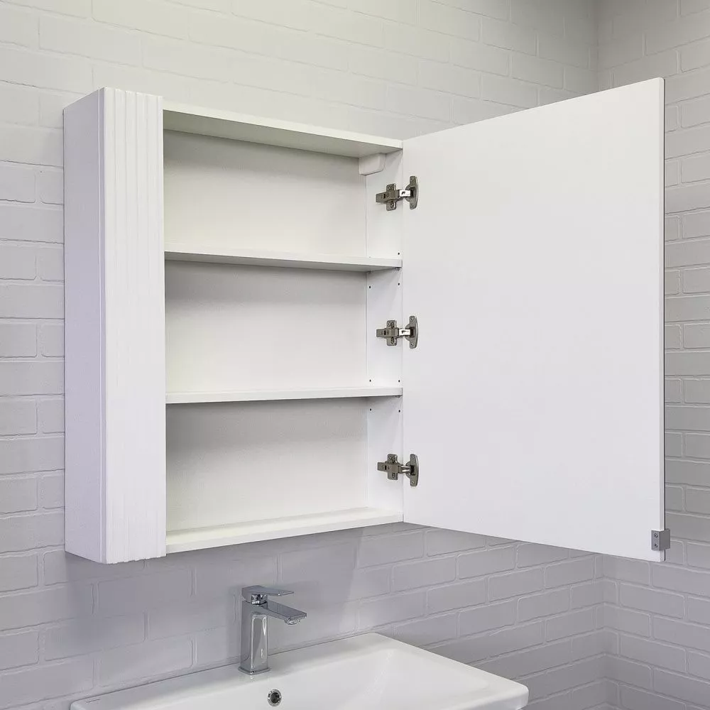 Материал панелей: МДФ Габариты (ШхВхГ): 700*800*175 мм Зеркальное высококачественное полотно с амальгамой на основе серебра. Створка декорирована вертикальной фрезеровкой и оснащена петлями плавного закрывания. За створкой две полки. В модели применяется плёнка с эффектом Soft-Touch.