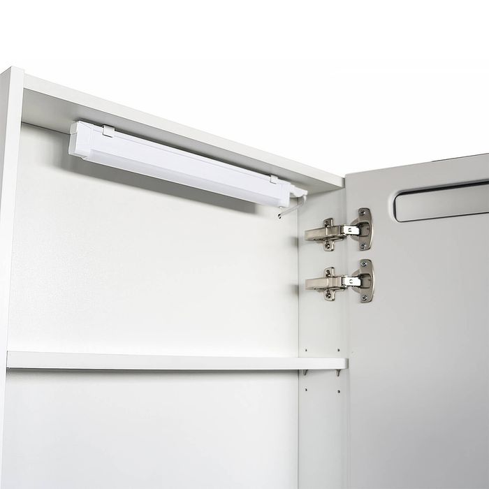 Створка оснащена петлями с плавным закрыванием. Высококачественное зеркальное полотно с амальгамой на основе серебра. Створка зеркала открываются наружу. За створкой две горизонтальные полки. На нижней внешней полке можно расположить невысокие принадлежности для умывания. В комплекте светодиодный светильник с матовым плафоном. Температура светильника 4200 K Название: Шкаф-зеркало Артикул: 00-00014144CF Цвет: Дуб белый Габариты (ШхВхГ): 600*800*145 мм. Инструкция для мебели для ванных комнат COMFORTY