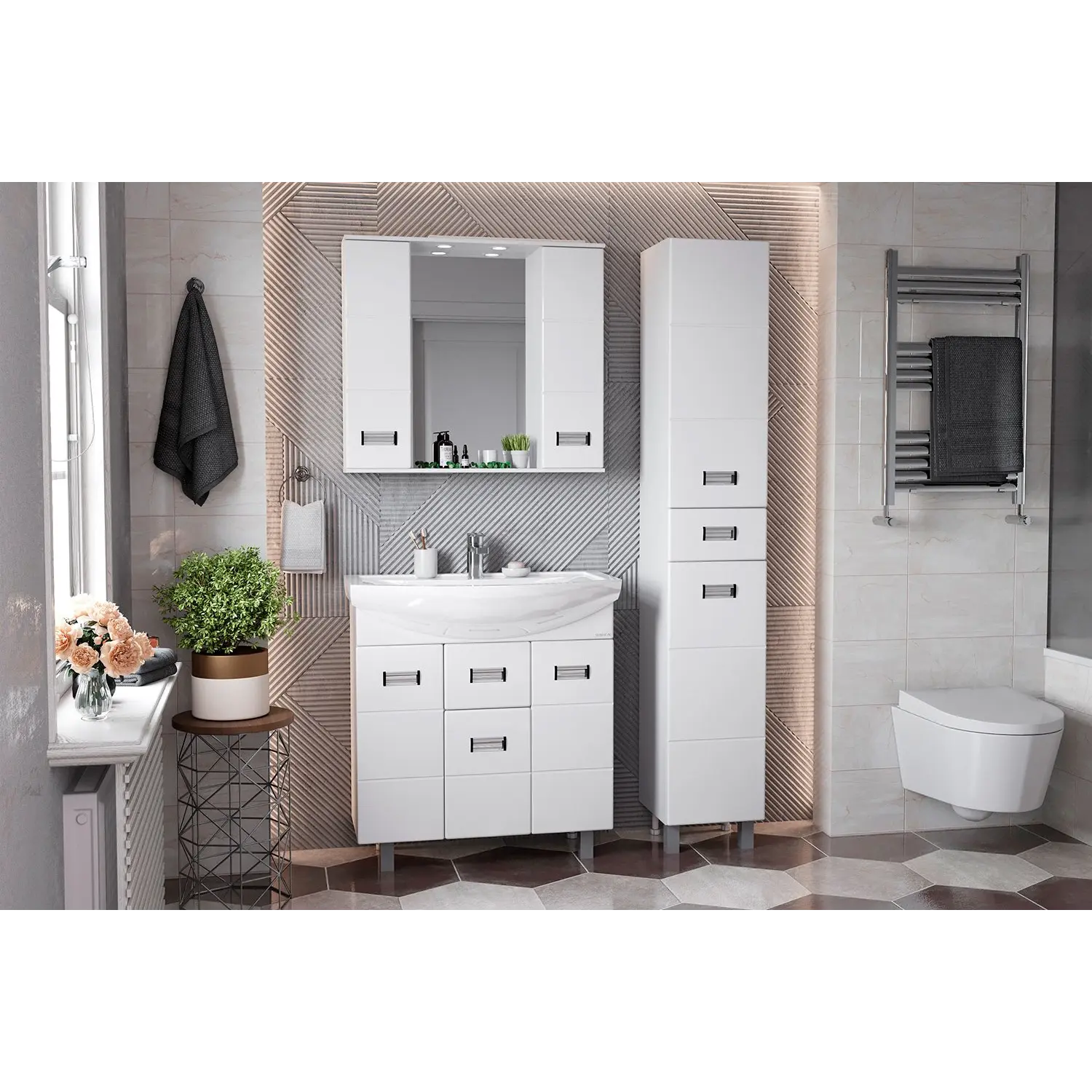 Корпус шкафа-зеркала выполнен из ЛДСП, фасад – из МДФ в пленке, устойчивых к механическим воздействиям, перепадам температур и высокой влажности.