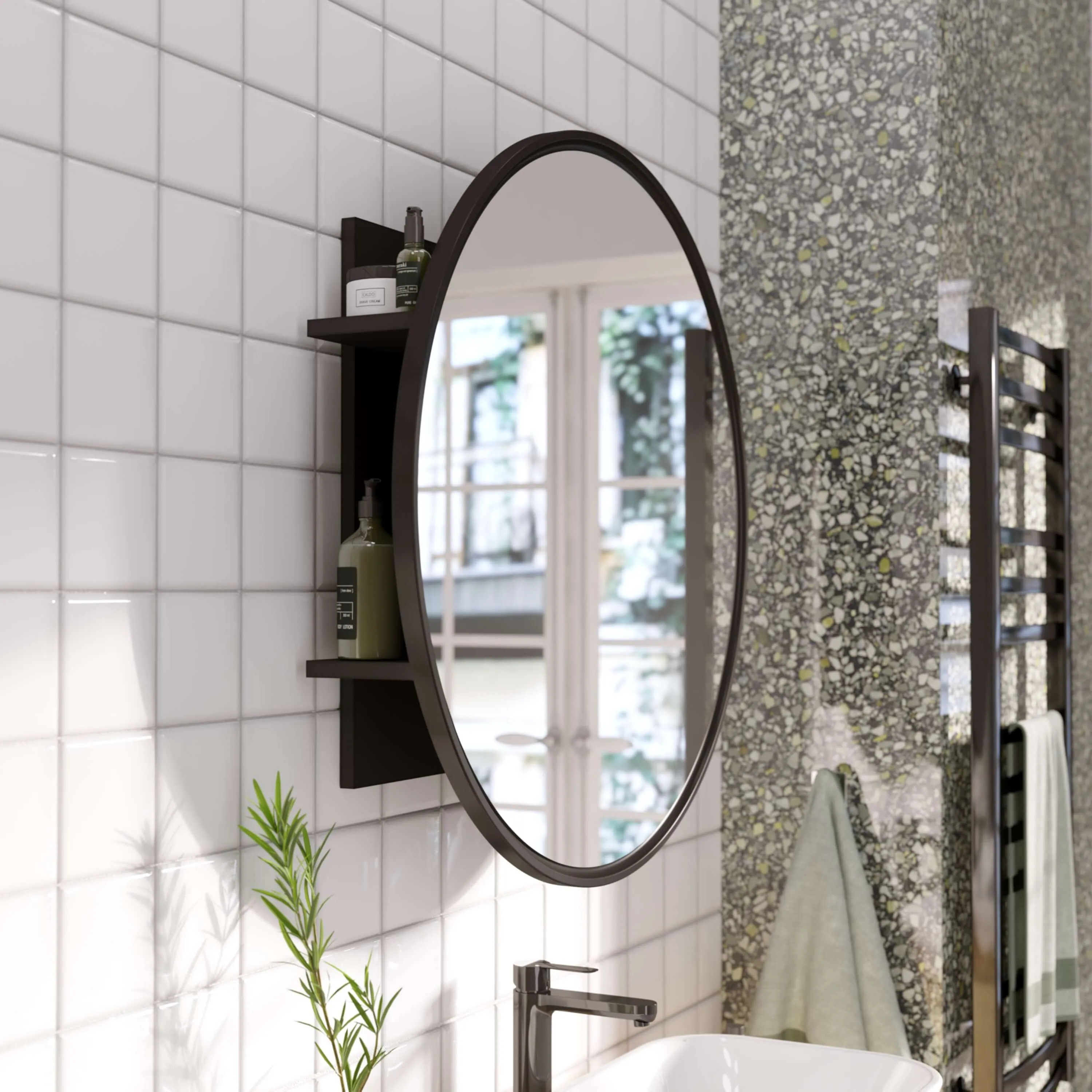 Круглое зеркало Mystery со скрытыми полками — идеальное дополнение к любой ванной комнате. Оно сочетает в себе эстетику и функциональность, делая ежедневные процедуры более приятными и комфортными.