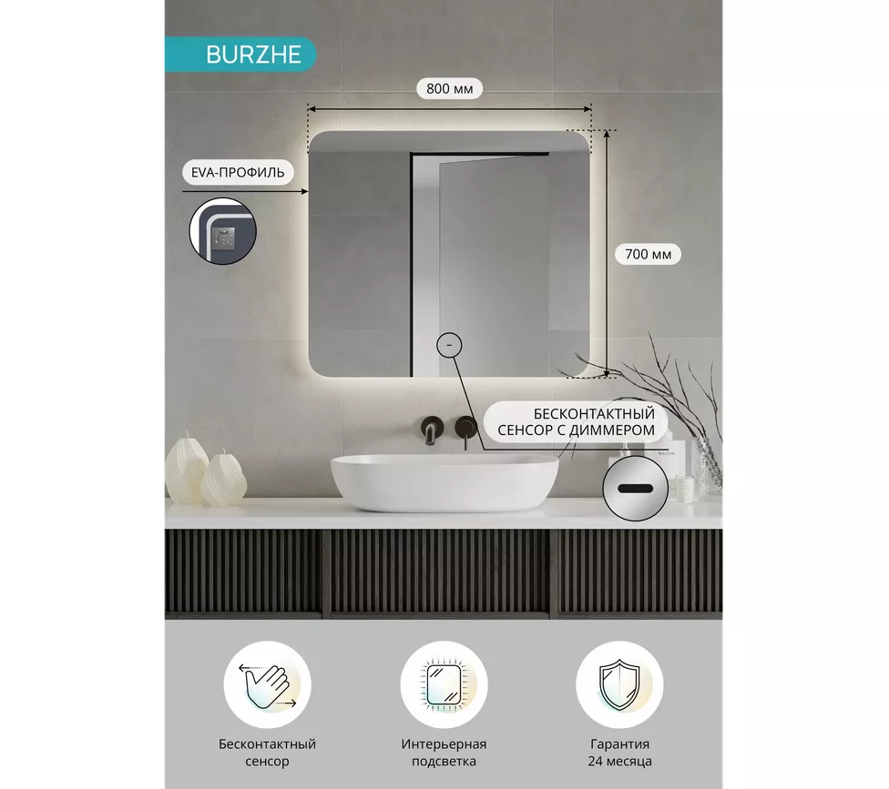 Зеркало с подсветкой "Burzhe Led" с бесконтактным сенсором, холодная подсветка - это настенное зеркало нового поколения, изготовленное из полотна толщиной 4 мм от ведущего европейского производителя AGC. При изготовлении используется светодиодная лента с плотностью диодов 120 шт/м и мощностью 9,6 Вт/м, обеспечивающая яркое и равномерное свечение. "Burzhe Led" с бесконтактным сенсором, холодная подсветка . Для управления подсветкой используется бесконтактный cенсор. Температура ореольной подсветки холодная - 5000К, потребляемая мощность 34 Вт. Основа для изделия - корпус из МДФ рамка белого цвета. Срок гарантии - 2 года.