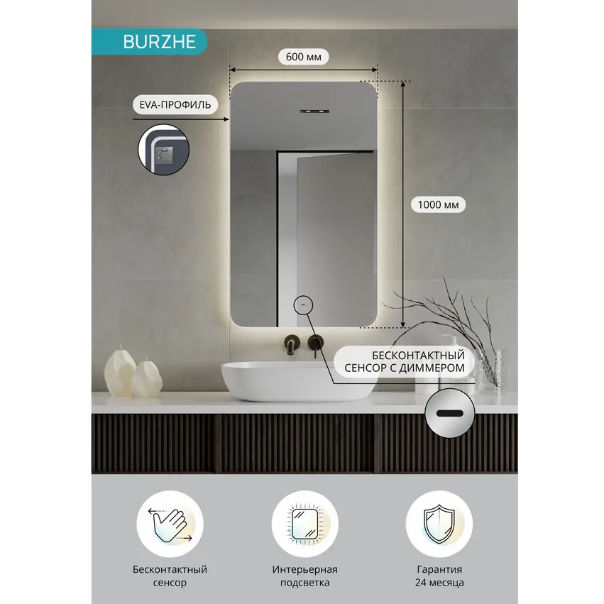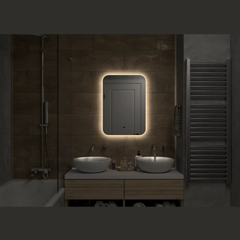 Зеркало "Burzhe" прямоугольной формы с плавно скругленными углами и бесконтактным сенсором. Корпус зеркала изготовлен из белого МДФ, что придаёт ему современный и элегантный вид. Открытая ореольная подсветка обеспечивает дополнительное освещение в интерьере, создавая эффект парящего зеркала. Включить подсветку можно простым движением руки на расстоянии до 5 см от бесконтактного сенсора, что делает его использование особенно удобным. Это зеркало не только является стильным и функциональным элементом вашего интерьера, но и придаёт помещениям уникальности. Оно акцентирует внимание на красоте вашего пространства и формирует атмосферу уюта, а качественное освещение значительно упрощает повседневные процедуры, делая их более комфортными и приятными.