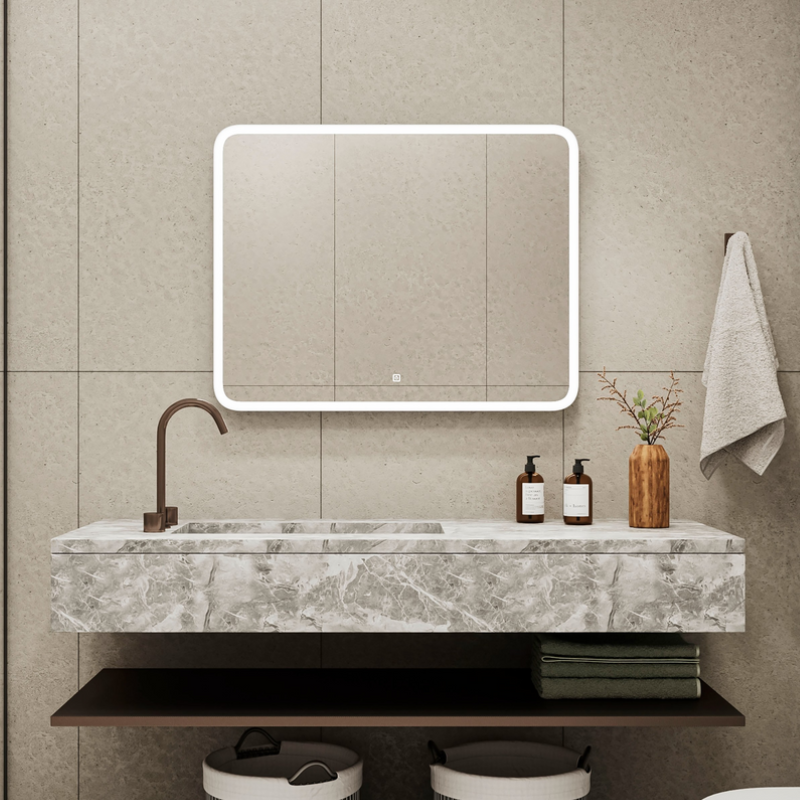 Зеркало "Demure" с мягкими углами и сенсором на касание. Ширина светящейся полосы составляет 20 мм, а корпус выполнен из белого пластика. Зеркало оснащено фронтальной подсветкой с холодной цветовой температурой (5000K), что обеспечивает отличное освещение отражаемых объектов. Подсветка активируется через сенсор с встроенным диммером, который настраивается путем изменения времени касания. Зеркало с подсветкой — стильное и функциональное дополнение, придающее вашему пространству уникальность. Оно подчеркивает красоту интерьера и создает атмосферу уюта, а качественное освещение делает повседневные процедуры более приятными и легкими.