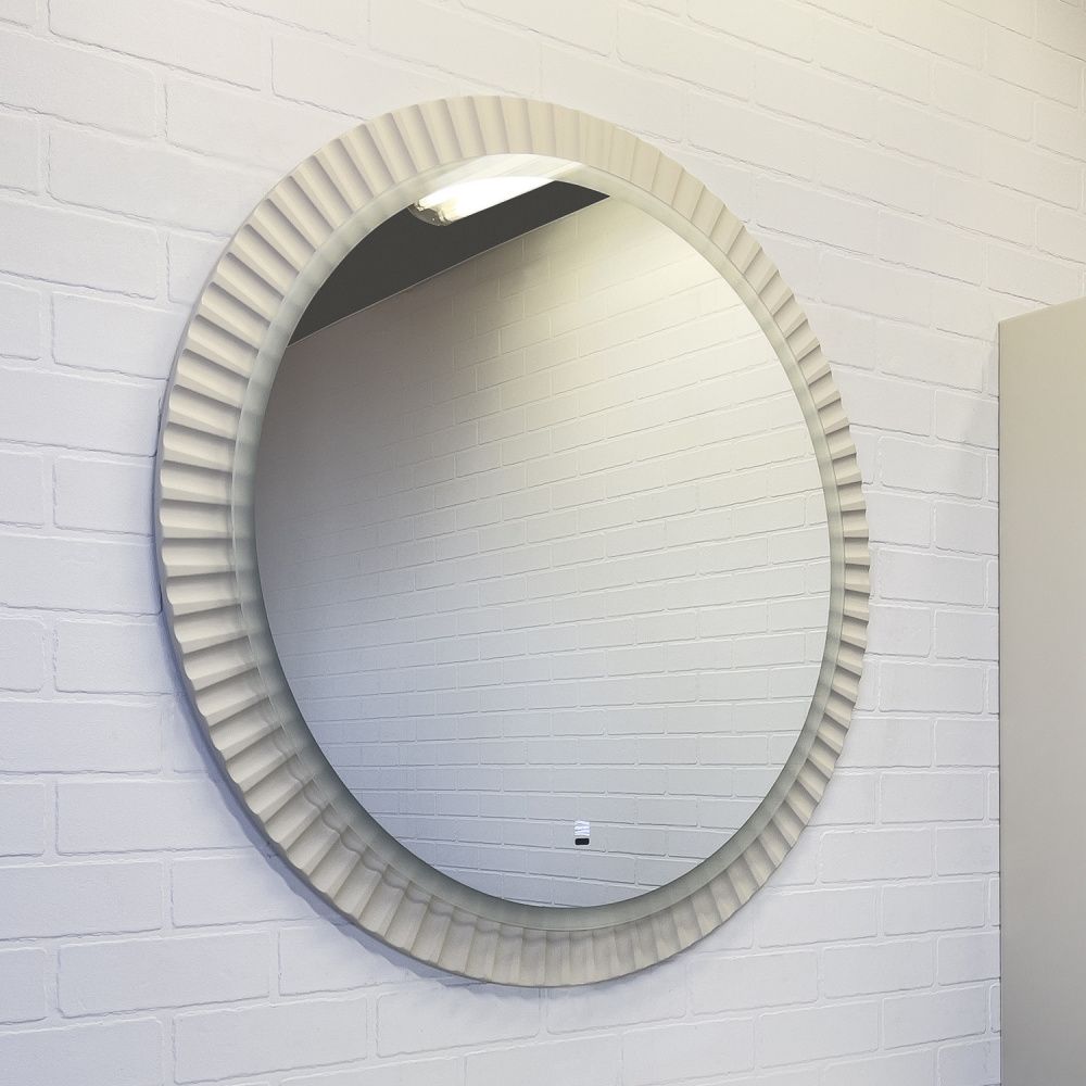 Торговая марка: Comforty Название: Зеркало Коллекция: Мадрид Артикул: 00-00014251CF Варианты цвета: серый шёлк Материал основы: МДФ Габариты (ШхВхГ): 700*700*30 мм Высококачественное зеркальное полотно с амальгамой на основе серебра. Зеркало оборудовано ореольной и фронтальной Led подсветкой с бесконтактным включателем со встроенной функцией регулировки яркости. Температура подсветки: 6000-6500К холодная. Основа зеркала из МДФ фрезерована радиальным узором в виде лучей и облицована матовой пленкой цвета серый шёлк.