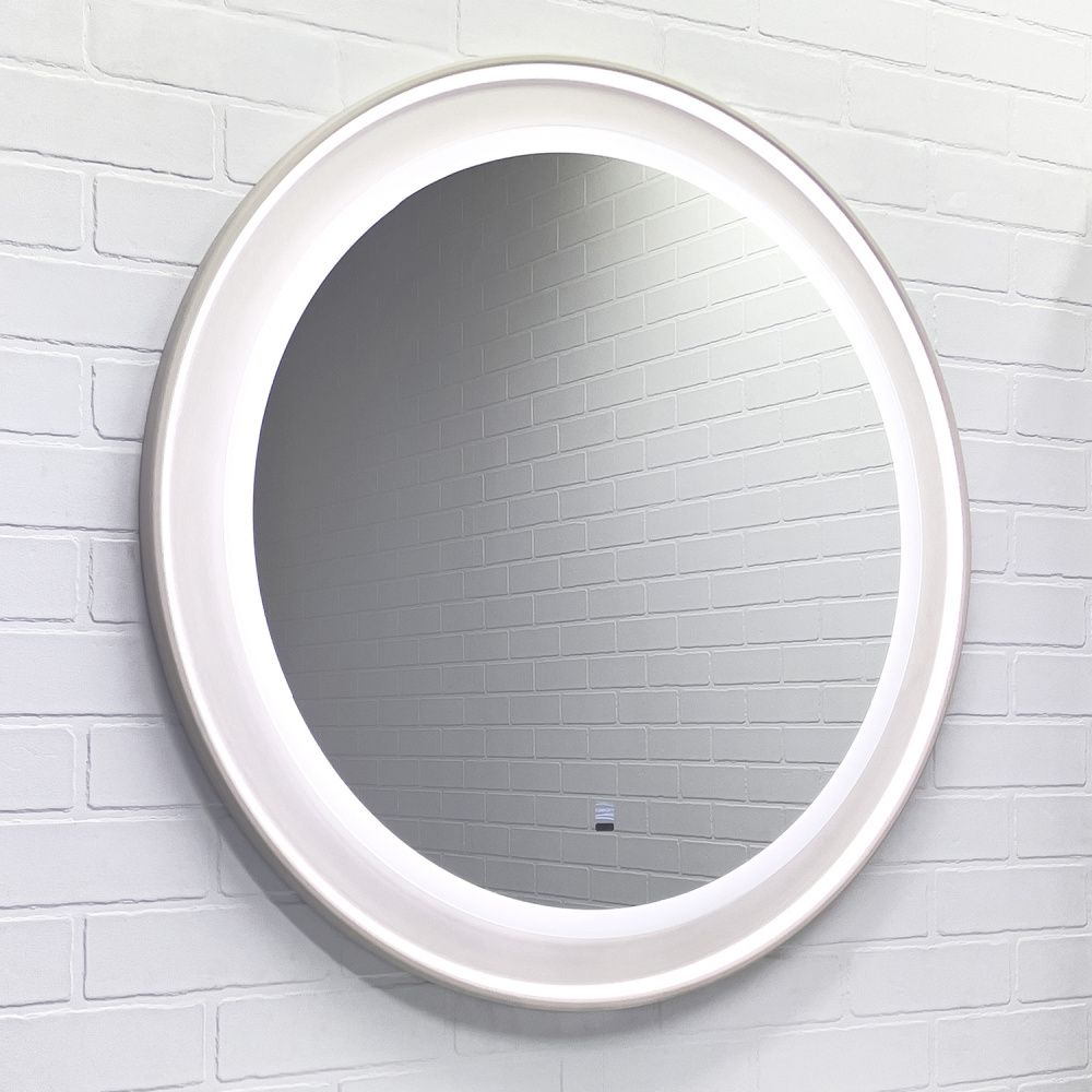 Высококачественное зеркальное полотно с амальгамой на основе серебра. Зеркало оборудовано ореольной и фронтальной Led подсветкой с бесконтактным включателем со встроенной функцией регулировки яркости. Температура подсветки: 6000-6500К холодная. Основа зеркала из МДФ фрезерована кантом по периметру и облицована в матовую пленку цвета "серый шёлк".