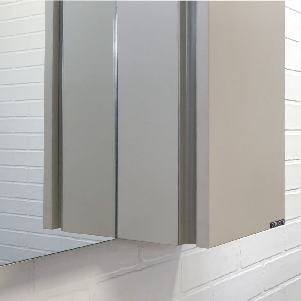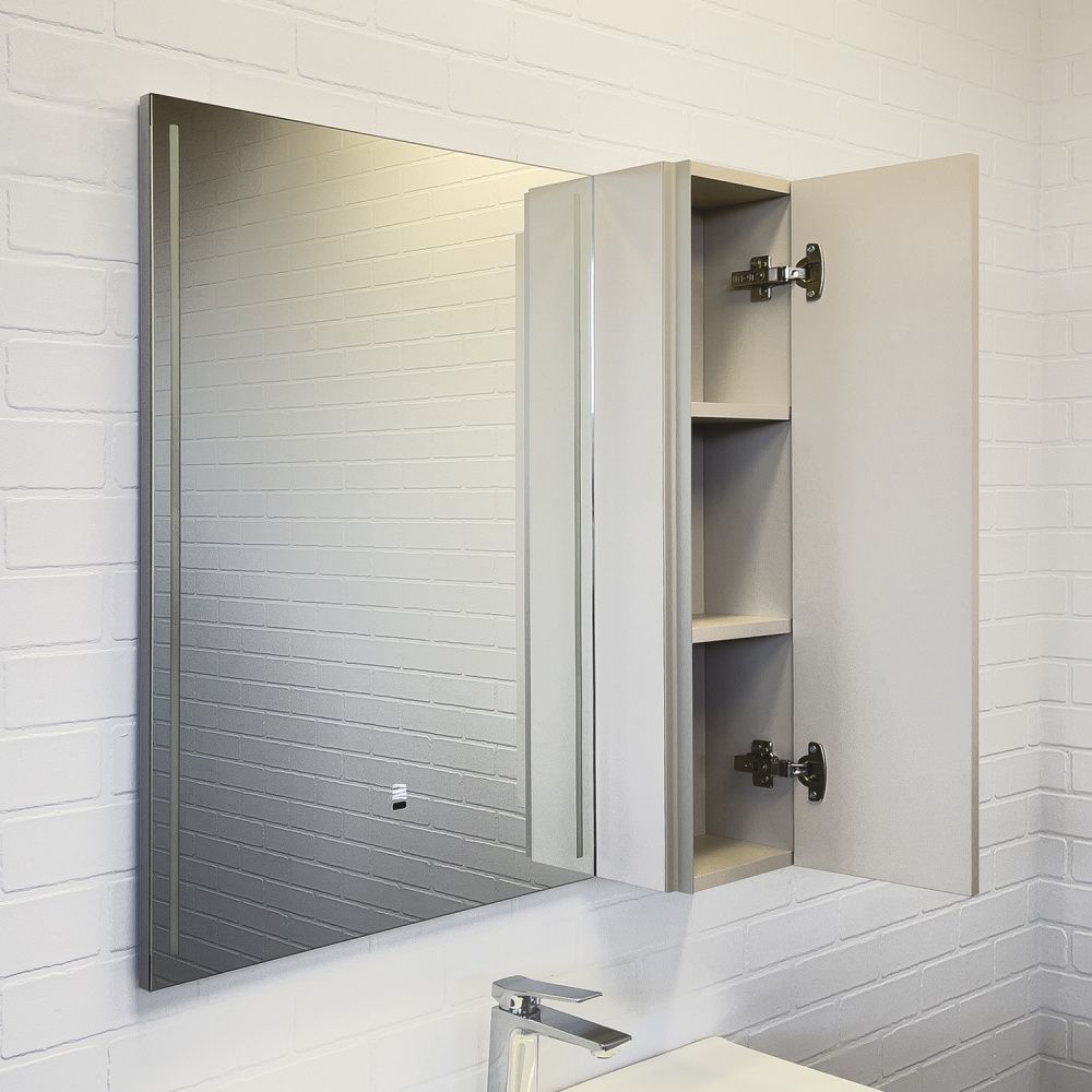 Материал фасада и боковых стенок: плита AGT - МДФ облицованный с двух сторон пленкой c эффектом soft touch Габариты ШхВхГ: 800х800х165 мм Зеркальное высококачественное полотно с амальгамой на основе серебра. Створка оснащена петлями с системой плавного закрывания. За створкой две полки. Открытие створки производится при помощи вертикальной профильной ручки интегрированной в левую боковую стенку шкафчика. Зеркало оборудовано фронтальной LED подсветкой с бесконтактным выключателем со встроенной функцией регулировки яркости. Температура подсветки 6000-6500K холодный свет. Зеркало-шкаф выпускается только с правым размещением мебельного элемента.