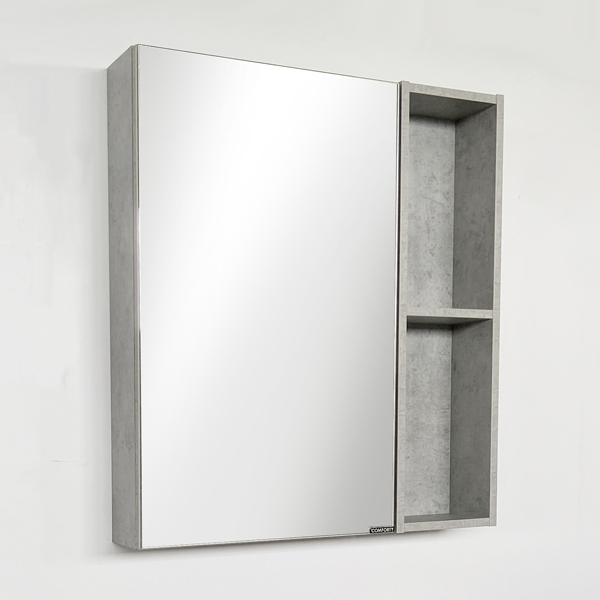 Высококачественное зеркальное полотно с амальгамой на основе серебра. Створка оснащена петлями с плавным закрыванием. Петли у створки снаружи. За зеркальной створкой две горизонтальные полки, в пространстве открытого хранения - одна. Зеркало-шкаф универсально - может быть подвешено в правом и левом варианте.