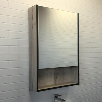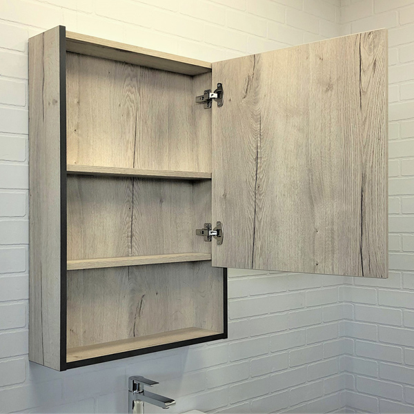 Зеркало-шкаф. Створка оснащена петлями с плавным закрыванием. За створкой одна горизонтальная полка. Высококачественное зеркальное полотно с амальгамой на основе серебра. Конструкция шкафа позволяет смонтировать зеркальную створку для открывания как вправо, так и влево.