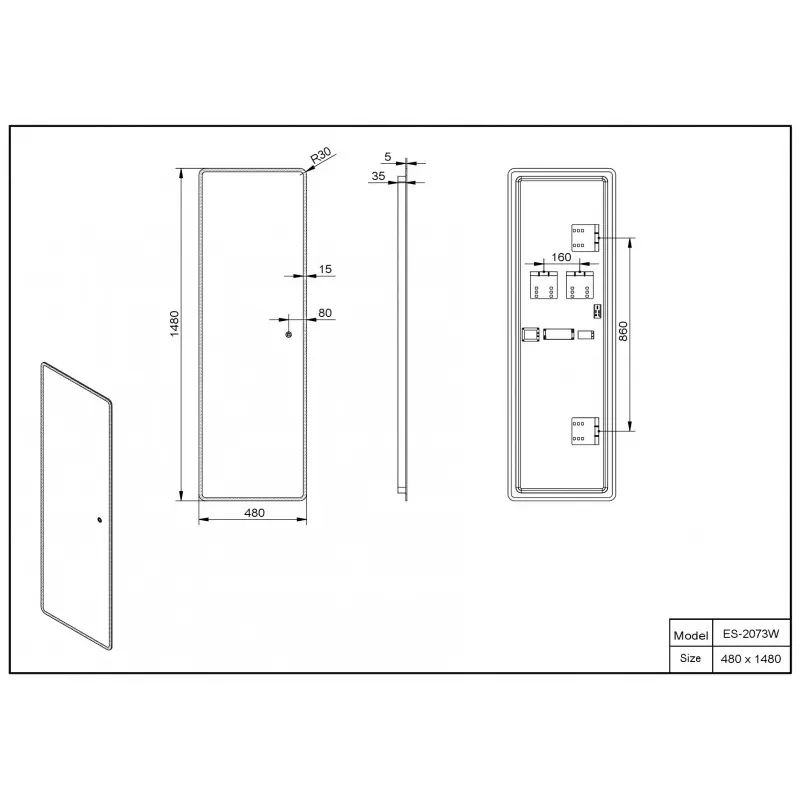 ЗЕРКАЛО ESBANO ES-2073 W СО ВСТРОЕННОЙ ПОДСВЕТКОЙРАЗМЕР: 480Х1480Х50алюминиевый корпусисточник света: светодиоды (LED) 40Вт IP24сенсорный выключателькомплект крепежа