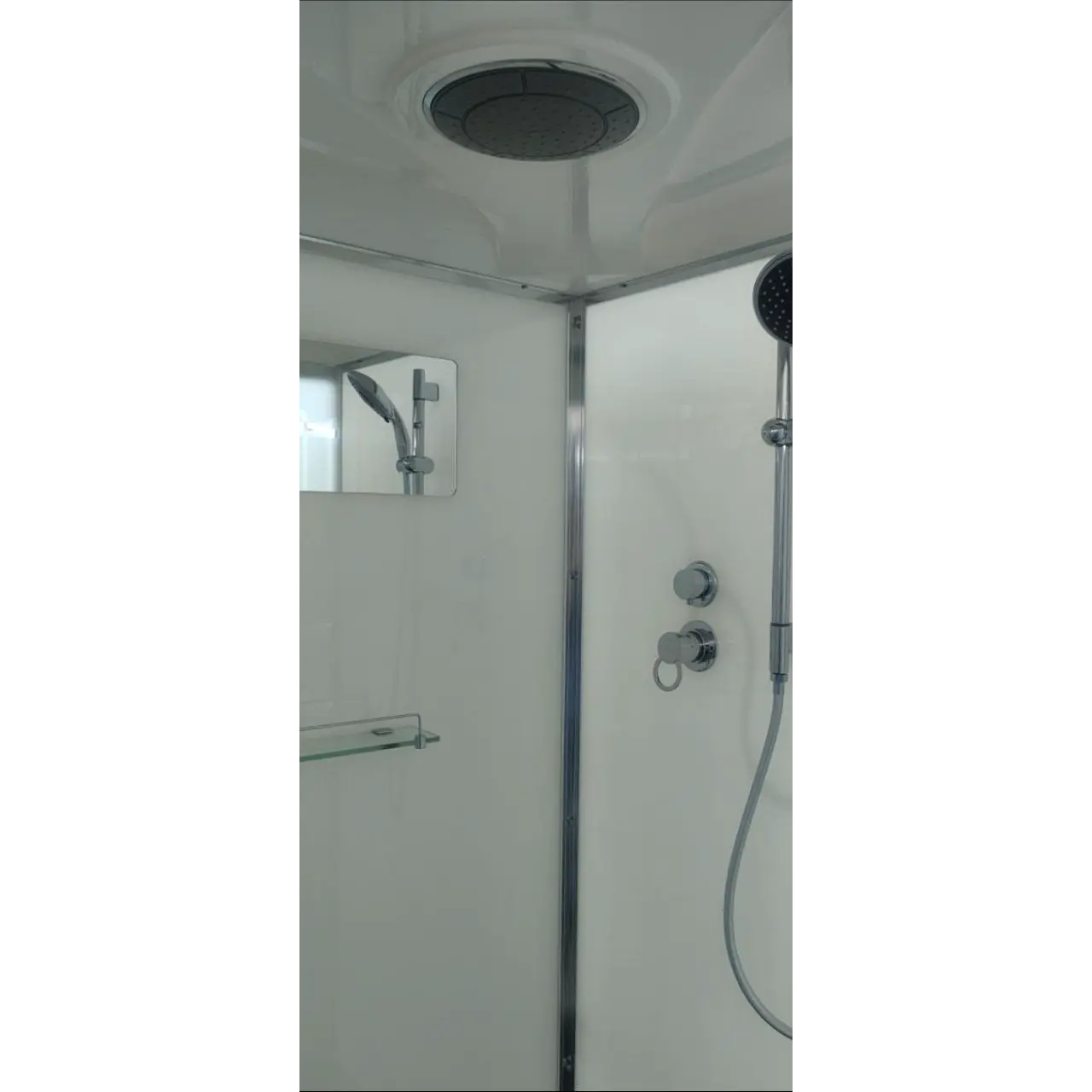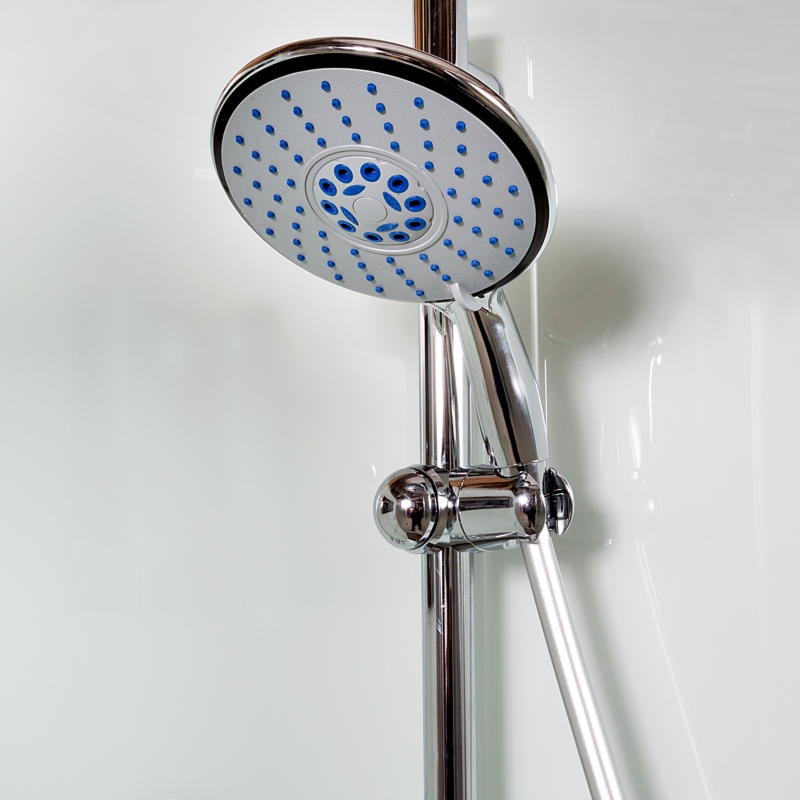 Вентиляция / Деревянная вставка в поддон / Душевой гарнитур / Зеркало / Переключатель режимов / Полочка / Сифон / Смеситель / Тропический (верхний) душ