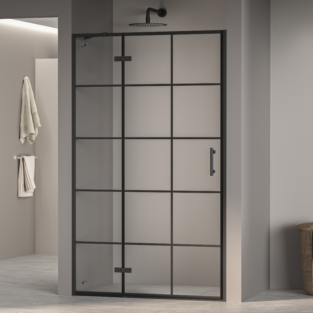 Душевая дверь распашная RGW PA-07. Черный алюминиевый профиль, черные оцинкованные петли, ручка из нержавеющей стали, закаленное стекло с покрытием EasyClean и нанесенным принтом шелкографией. Трап или поддон приобретается отдельно.
