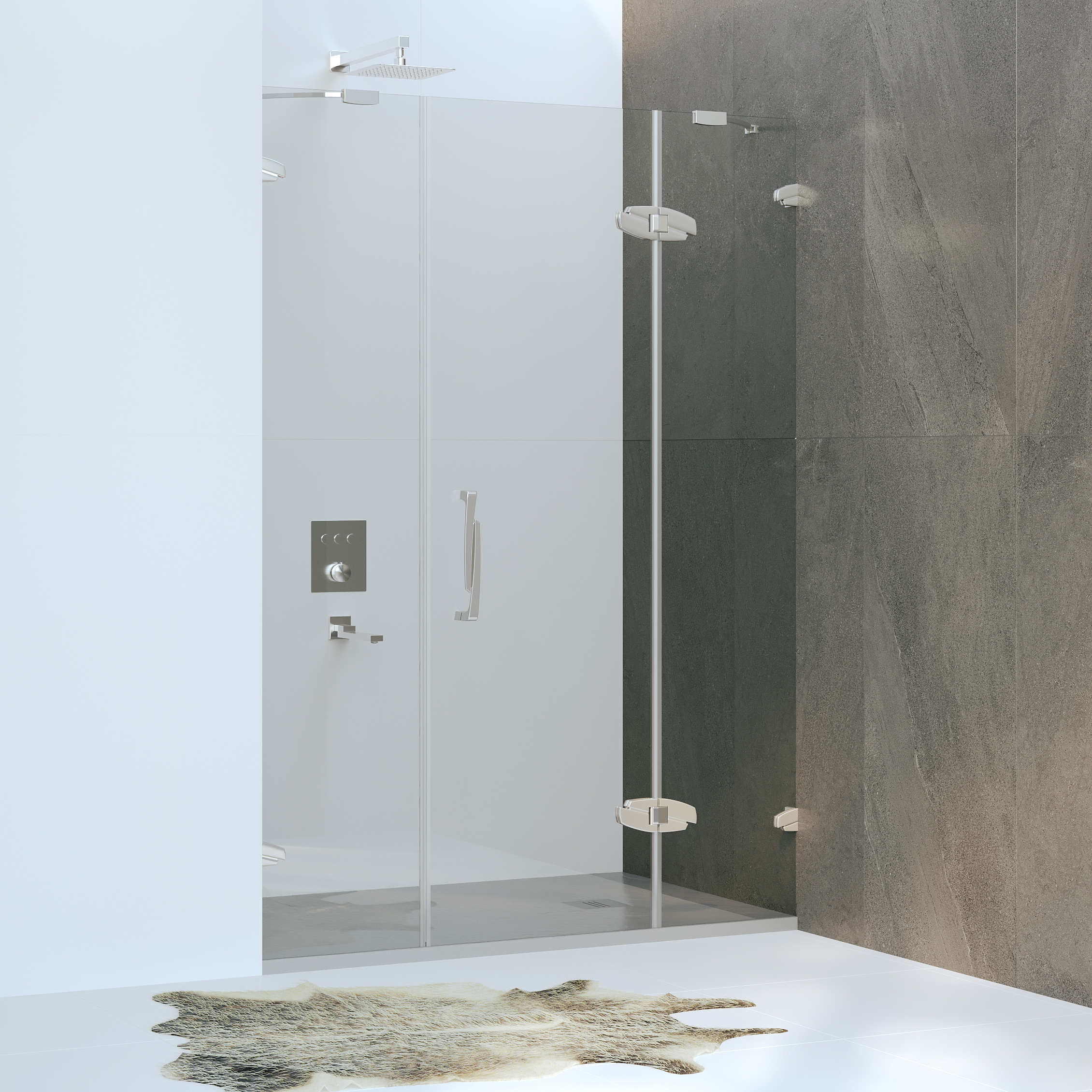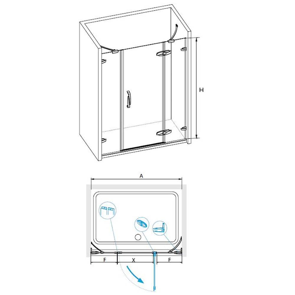Душевая дверь распашная с центра. Цветные петли, дверная ручка и пристенные петли, сменные аксессуары. В комплекте нижняя пороговая планка. Трап или поддон приобретается отдельно.