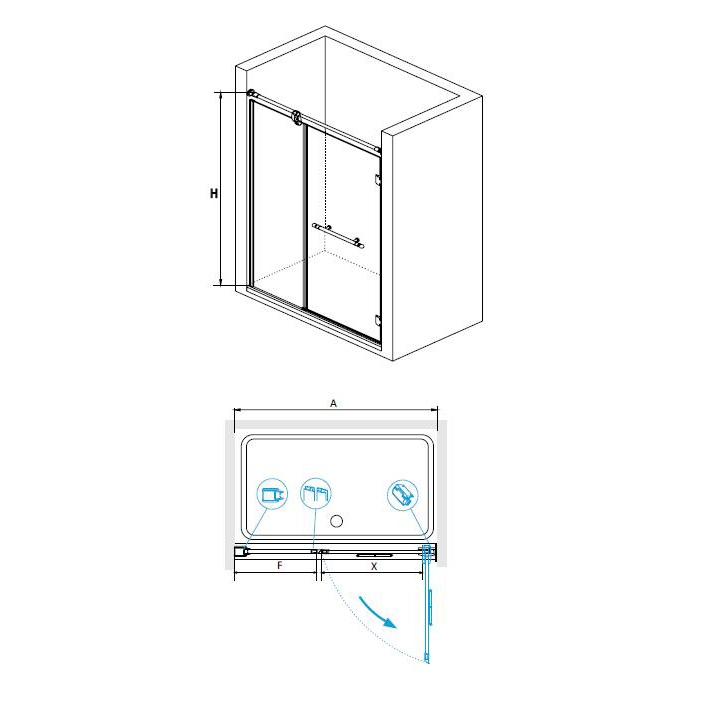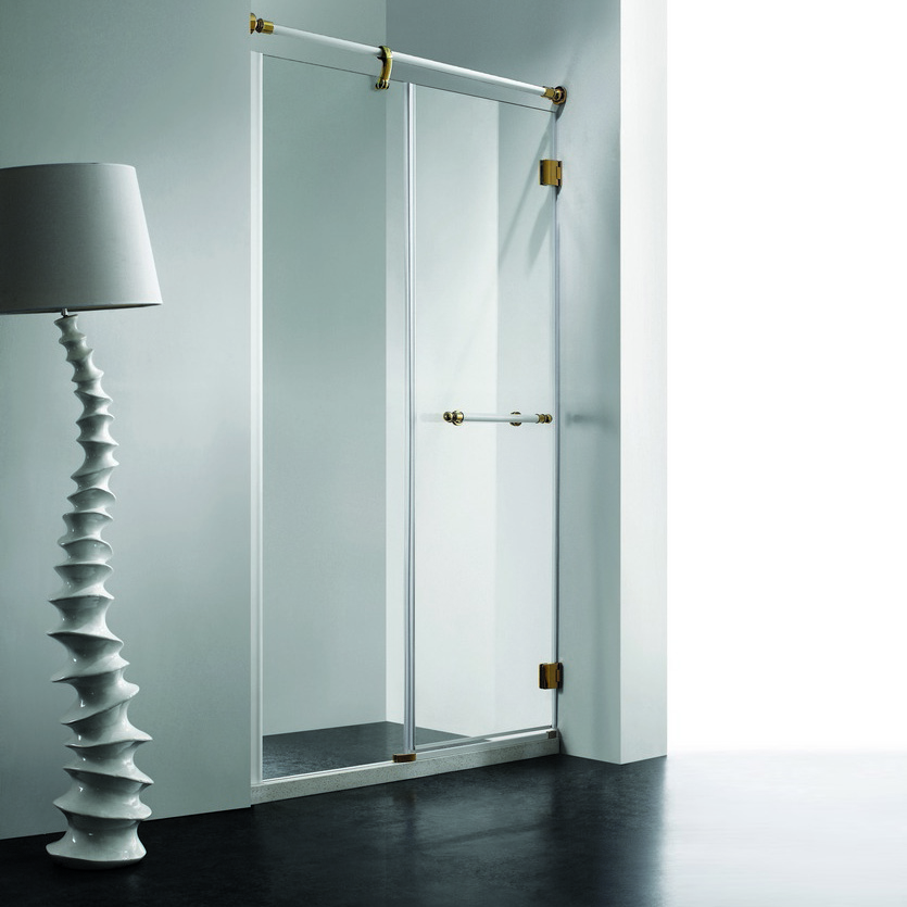 Душевая дверь распашная из центра. Петли цвета золото, ручка и верхний кронштейн белый с золотом. В комплекте нижняя пороговая планка. Трап или поддон приобретается отдельно.
