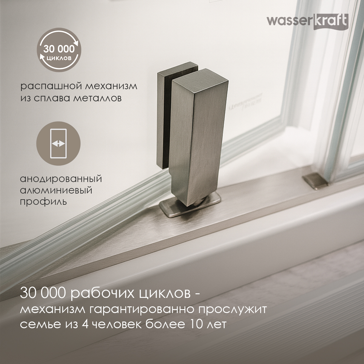 4) Распашной механизм из латуни - Механизм рассчитан минимум на 30 000 рабочих циклов. Это значит, что семья из четырех человек сможет пользоваться душевым уголком минимум 10 лет. Распашной механизм дает возможность широкого проема для входа внутрь душевого уголка.