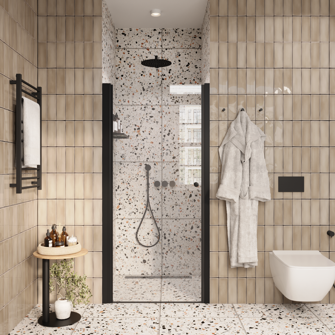 Дверь DE80B душевая в нишу PARLY (80x185)Размер: 80х185 смРаспашная дверь образует вход комфортной ширины. Модель из прозрачного закаленного стекла (5 мм). Полотно устойчиво к случайным ударам. В случае битья, стекло рассыпается на множество мелких частей с тупыми гранями.Алюминиевый черный профиль не деформируется при высокой влажности и смене температуры. Дверь имеет уплотнители под углом 45 градусов.Дверь открывается только в одну сторону.Достоинства душевой двери:Защищает ванную комнату от брызг воды. Пол возле душевой зоны остается сухим, что снижает шансы поскользнуться после водных процедур.Душевая дверь помогает зонировать помещение на отдельные функциональные участки. Особенно это актуально для совмещенного санузла и небольших ванных комнат.Двери из стекла практичны, долговечны и гигиеничны. На стеклянной поверхности не скапливаются бактерии и грязь, полотно легко чистить.Дизайн двери дополнит стилистическую задумку оформления ванной.При правильном уходе душевая дверь долгие годы сохраняет эстетический внешний вид. Для чистки необходимо использовать мягкие губки и салфетки, специальные жидкие чистящие средства.Нельзя использовать жесткие губки и абразивные порошки, которые оставляют мелкие царапины. Как результат, в них скапливается грязь и размножаются бактерии. Поэтому важно правильно чистить стеклянные поверхности.Внимание! Производитель оставляет за собой право вносить изменения в конструкцию и комплектацию моделей без предварительного уведомления!