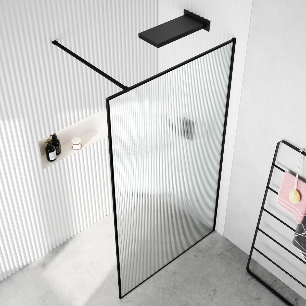 Планка крепления к стене имеет длину 1200мм, закаленное стекло (6 мм), узор гофрированная волна ,профиль черный, без поддона.