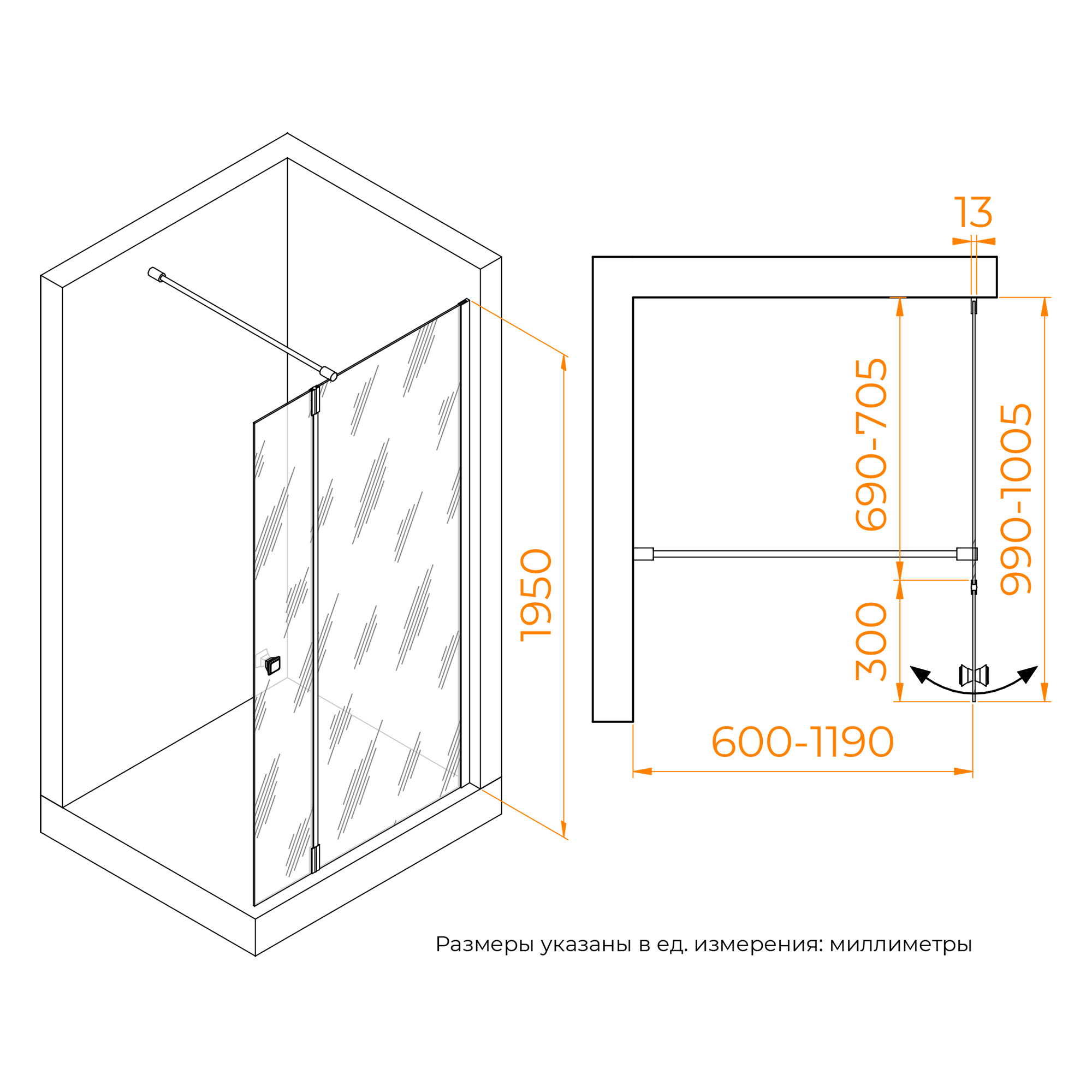 Душевая перегородка состоит из стационарного полотна и полотна с поворотной маятниковой частью - 300 мм. Стационарное стекольное полотно крепится к стене алюминиевым профилем с декоративной заглушкой. Подвижное полотно закреплено стальной маятниковой петлей с ходом 180 градусов.
