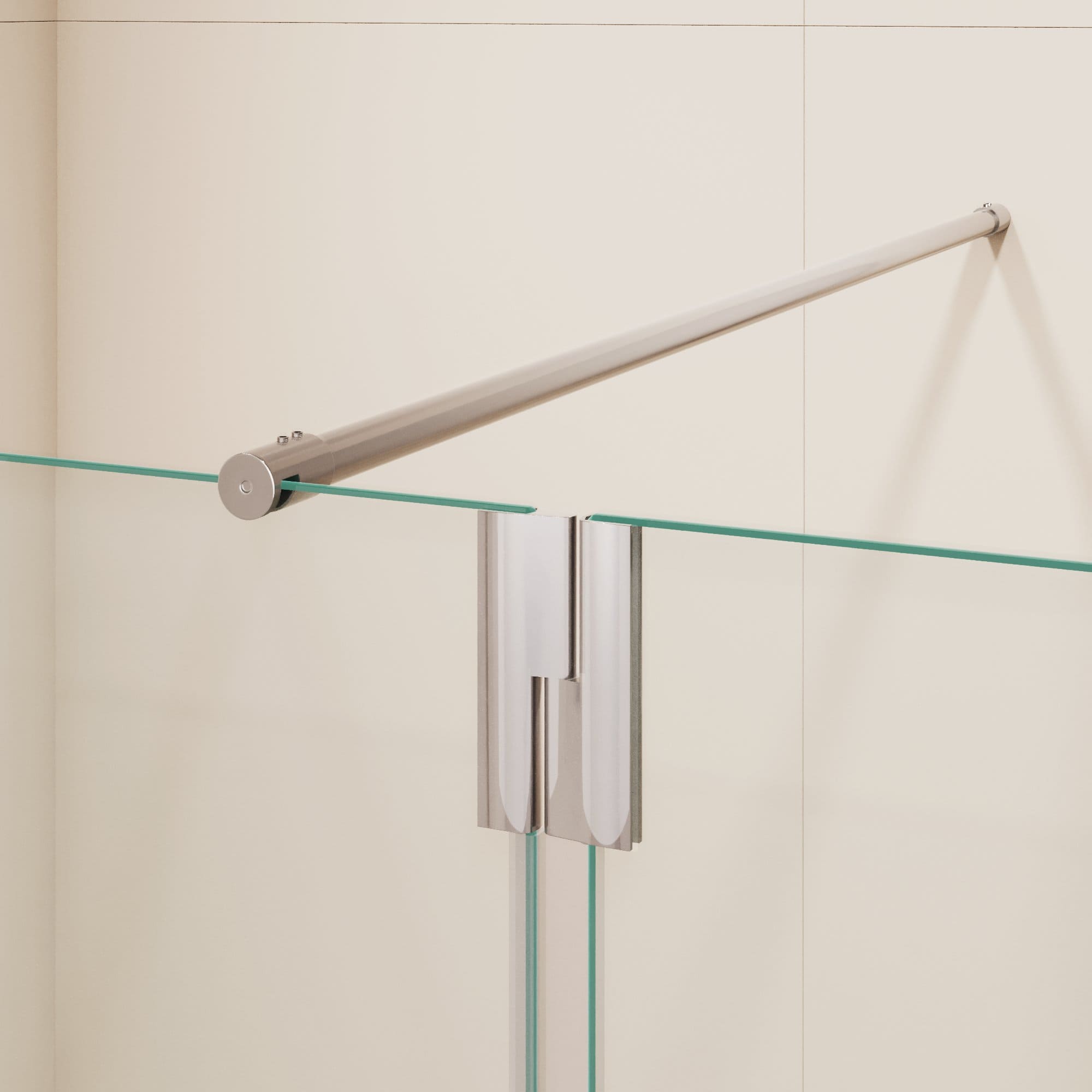 Душевая перегородка состоит из стационарного полотна и полотна с поворотной маятниковой частью - 300 мм. Стационарное стекольное полотно крепится к стене алюминиевым профилем с декоративной заглушкой. Подвижное полотно закреплено стальной маятниковой петлей с ходом 180 градусов.