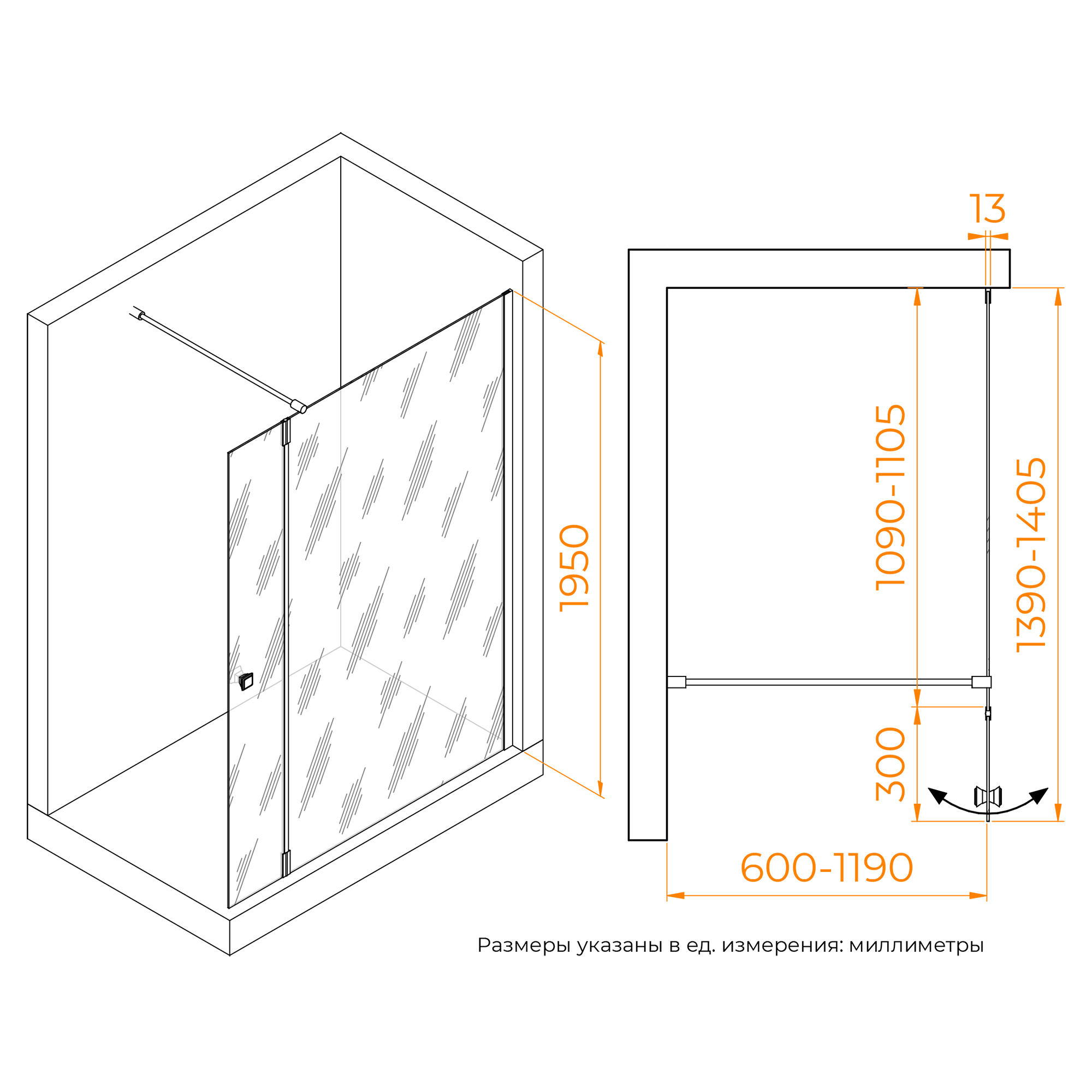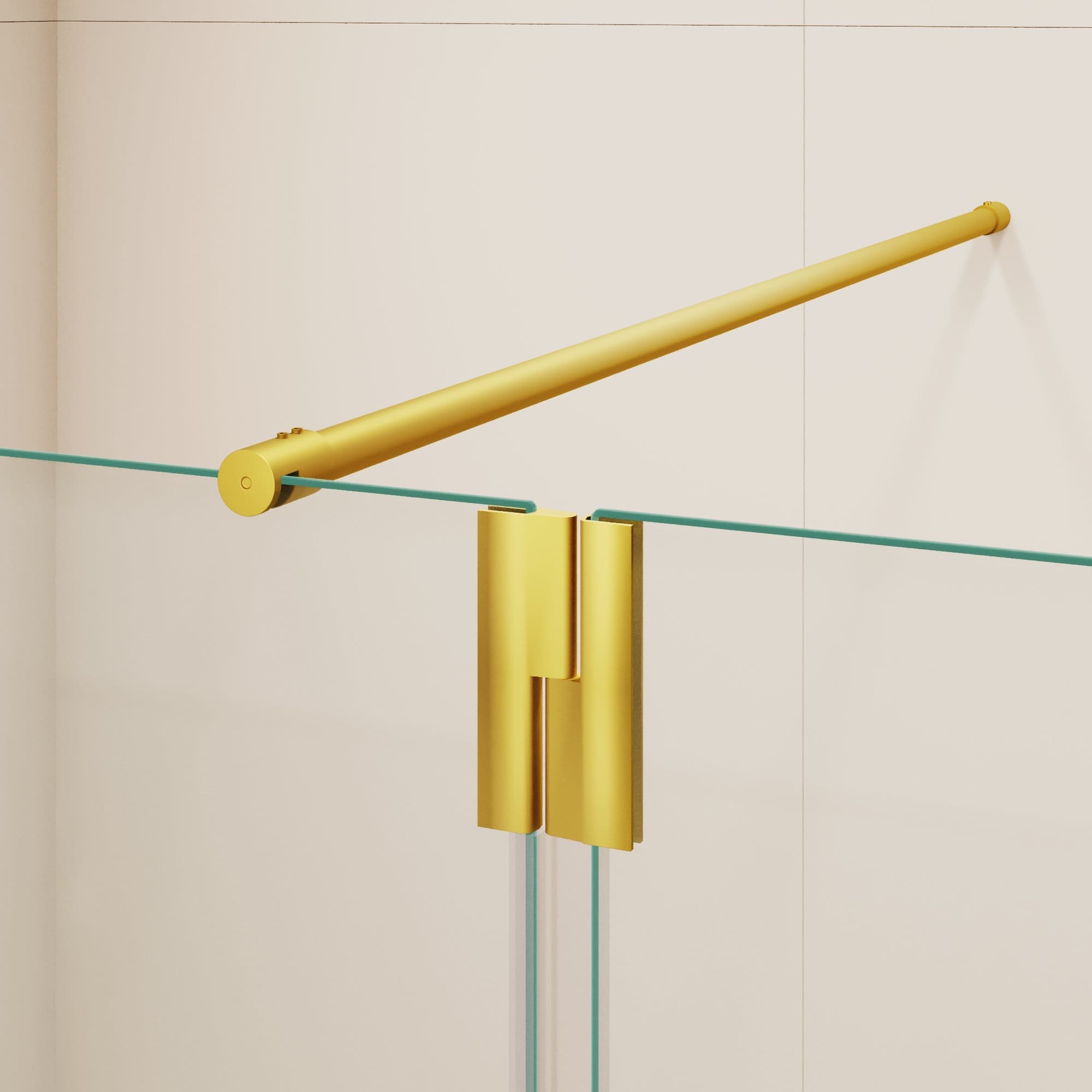 Душевая перегородка состоит из стационарного полотна и полотна с поворотной маятниковой частью - 300 мм. Стационарное стекольное полотно крепится к стене алюминиевым профилем с декоративной заглушкой. Подвижное полотно закреплено стальной маятниковой петлей с ходом 180 градусов.Перегородка выпускается с фурнитурой в 3-х вариантах:хром/черный/золото brush.