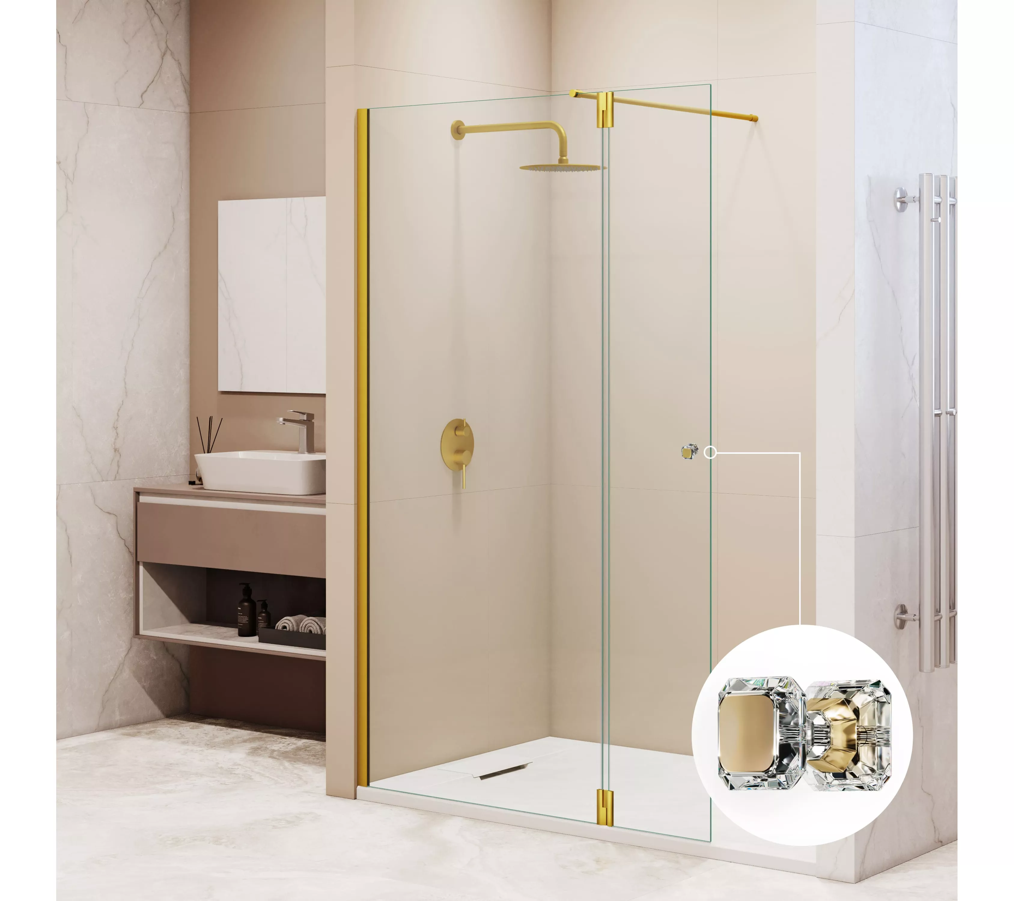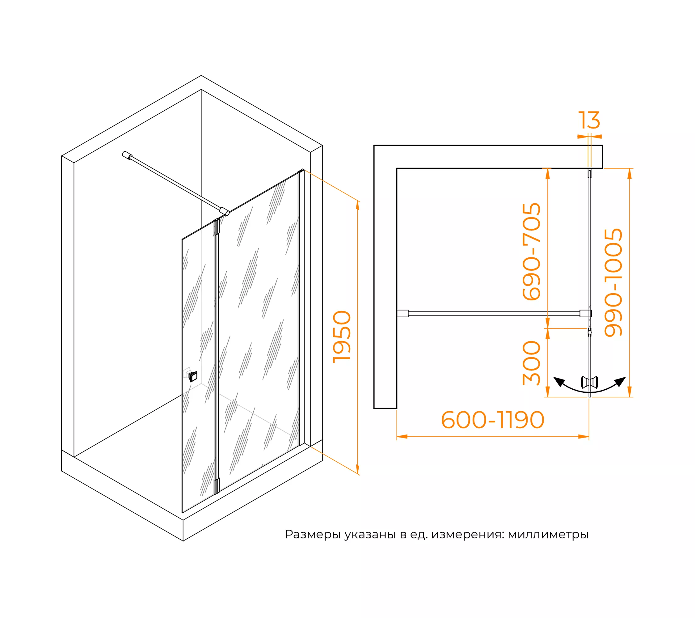 Душевая перегородка состоит из стационарного полотна и полотна с поворотной маятниковой частью - 300 мм. Стационарное стекольное полотно крепится к стене алюминиевым профилем с декоративной заглушкой. Подвижное полотно закреплено стальной маятниковой петлей с ходом 180 градусов.Перегородка выпускается с фурнитурой в 3-х вариантах:хром/черный/золото brush.
