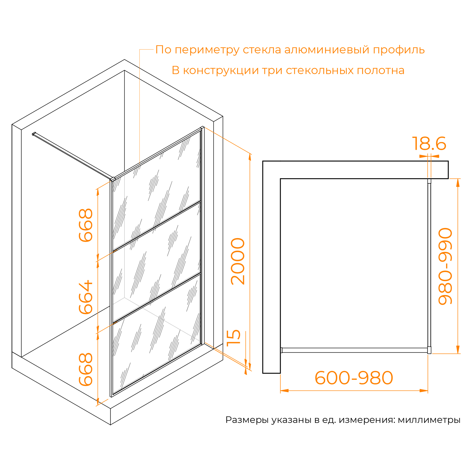 Пристенный профиль имеет регулировку, что позволяет нивелировать неровности стен.Стальная отрезная штанга длиной 1200 мм обеспечивает стабильность изделия. В процессе монтажа можно выбрать на каком расстоянии установить перегородку от противоположной стены, отрезая ненужную часть штанги. Рекомендованная минимальная длина штанги — не менее 700 мм.Для лёгкости очистки модель оснащена покрытием Easy Clean, которое предотвращает накопление известкового налёта и других загрязнений на стекле.Высота изделия: 2000 мм.