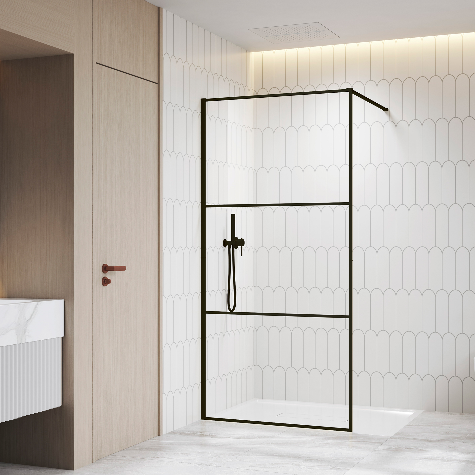 WA-09Модели представлены в трендовых цветовых решениях профиля: строгий чёрный и благородный золото браш.Разнообразные комбинации исполнения стекла:Ribbed Line (прозрачное + ребристое)ПрозрачноеТонированноеВысокопрочное премиальное закалённое стекло толщиной 8 мм, усиленный пристенный профиль ALUSTRONG MAX с антикоррозийной защитой и обрамление профилем по периметру каждого стекольного полотна (состоит из 3-х стекольных полотен) обеспечивают высокую надёжность и привлекательный внешний вид.