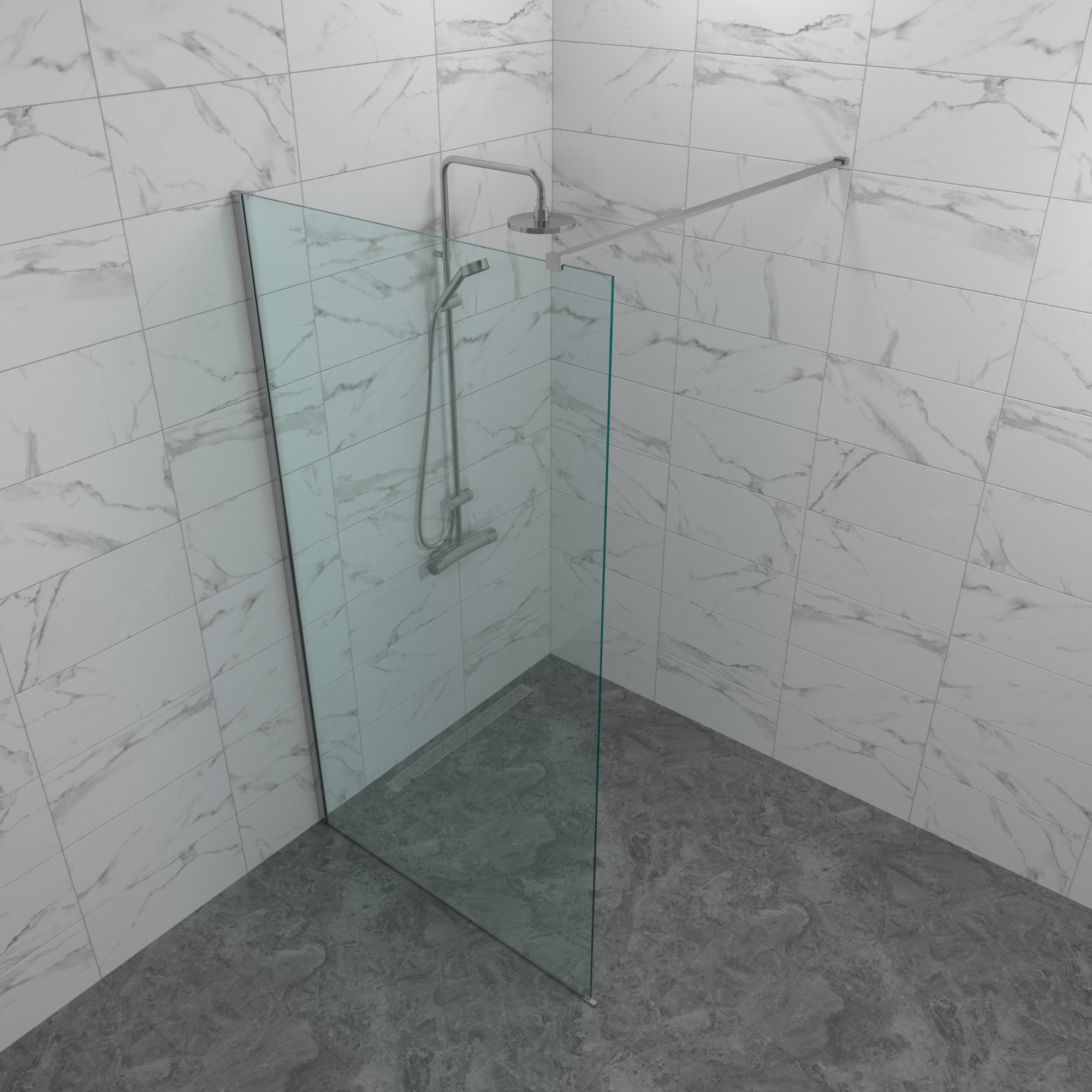 Стационарная стеклянная перегородка в нишу или как самостоятельный вариант из прочного прозрачного закалённого стекла толщиной 8 мм с хромированным профилем