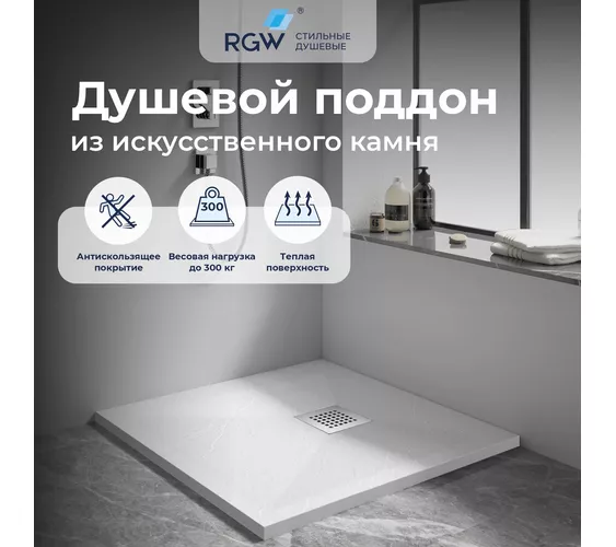 Доступная среда: отсутствие бортика позволяет создать удобный доступ в ванную комнату для людей с ограниченными возможностями здоровья.Гибкость установки: при невозможности утопить сливные трубы в стяжку, можно установить поддон на ножки RGW N-01(10), а образовавшееся пространство закрыть экраном GW N/ST.Технический уклон поддона обеспечивает быстрый слив воды в течение 20-30 секунд, даже при использовании крупной лейки или тропического душа.Сифон и решетка приобретаются отдельно. Решетка из нержавеющей стали (цвет Хром 304) и Сливной сифон Stone S-2 не включены в комплект, что позволяет избежать проблем с транспортировкой и недоставкой при совместной упаковке.Антивандальная упаковка гарантирует безопасную доставку поддона в любой уголок мира без повреждений.