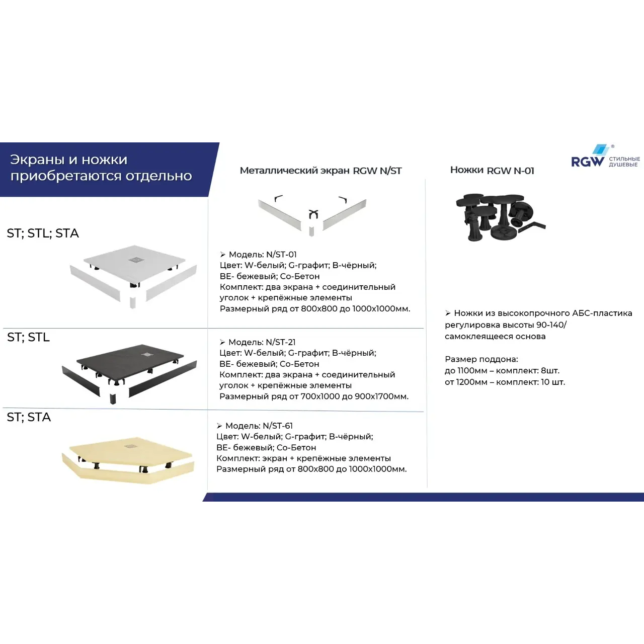 Возможна установка на ножки RGW N-1: Поддоны длинной до 1100 мм включительно комплект RGW N-08