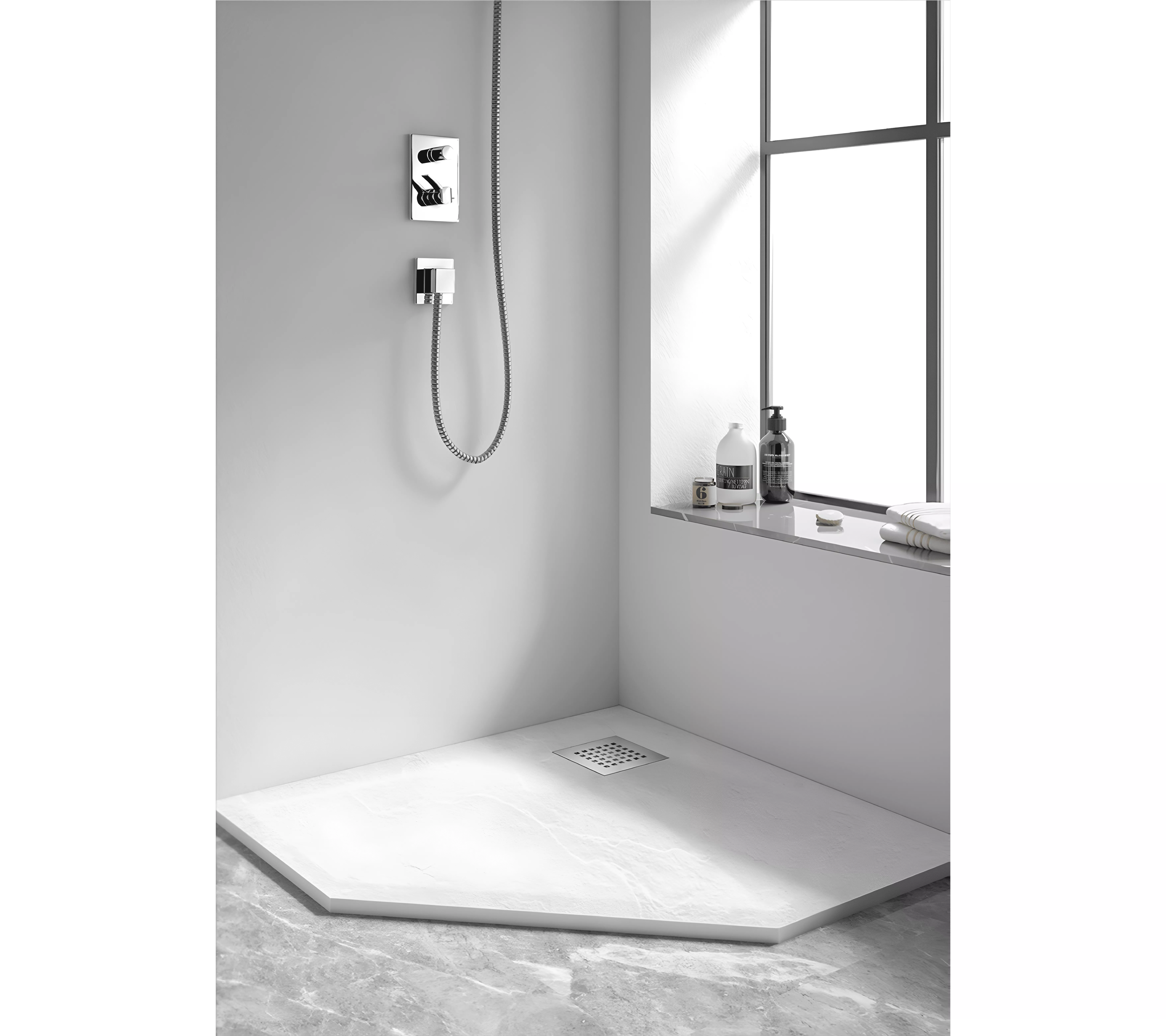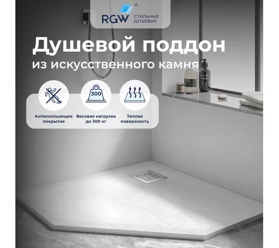 Душевой поддон из искусственного камня – идеальный выбор для вашего интерьера и удобства!Искусственный камень — это композитный материал, в составе которого полимерная смола и мраморная крошка. Поверхность поддона покрыта специальным Гелькоутом, который придает изделию стойкость к механическим повреждениям и агрессивным средам, а также обеспечивает долговечность.Антискользящая поверхность поддона имитирует натуральный камень и выдерживает нагрузку до 300 кг, что гарантирует безопасность при использовании.Разнообразие форм: поддоны доступны в конфигурациях квадрат, полукруг, прямоугольник и трапеция (пятиугольные), что позволяет выбрать подходящий вариант для вашего интерьера.Широкий размерный ряд: от 800x800 мм с шагом в 10 см до максимального размера 900x1200 мм, что дает возможность подобрать оптимальный поддон для вашей ванной комнаты.Монтаж в пол — поддон устанавливается в один уровень с полом для создания безбарьерного доступа, визуально расширяя пространство ванной комнаты.Доступная среда: отсутствие бортика позволяет создать удобный доступ в ванную комнату для людей с ограниченными возможностями здоровья.Гибкость установки: при невозможности утопить сливные трубы в стяжку, можно установить поддон на ножки RGW N-01(10), а образовавшееся пространство закрыть экраном GW N/ST.Технический уклон поддона обеспечивает быстрый слив воды в течение 20-30 секунд, даже при использовании крупной лейки или тропического душа.Сифон и решетка приобретаются отдельно. Решетка из нержавеющей стали (цвет Хром 304) и Сливной сифон Stone S-2 не включены в комплект, что позволяет избежать проблем с транспортировкой и недоставкой при совместной упаковке.Антивандальная упаковка гарантирует безопасную доставку поддона в любой уголок мира без повреждений.Срок службы поддона составляет не менее 25 лет, что делает его надежным выбором для долгосрочной эксплуатации.Приятная цена и дополнительные преимущества:Промкод для оптовой закупки от 30 штук.Для отелей, SPA и мест общего пользования — дополнительная страховка на эксплуатацию (по запросу у менеджера проекта).Быстрая доставка или самовывоз со склада в Московской области (Подольск, микрорайон Климовск, ул. Коммунальная 50).
