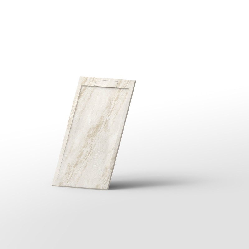 Поддон для душа прямоугольной формы.Материал: искусственный камень.Крышка слива из камня в цвет подддона.Структура поверхности: "мрамор матовый".Верхний слой поверхности: износостойкий Gel Coat.Цвет: бежевый мрамор.
