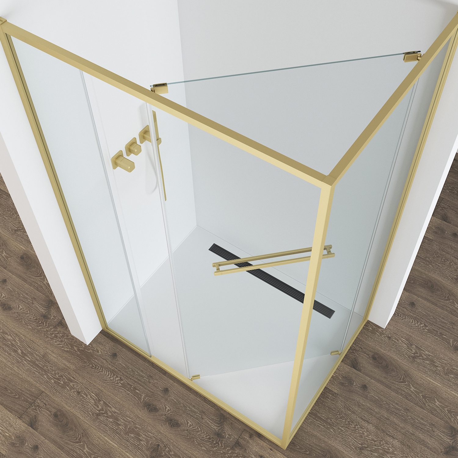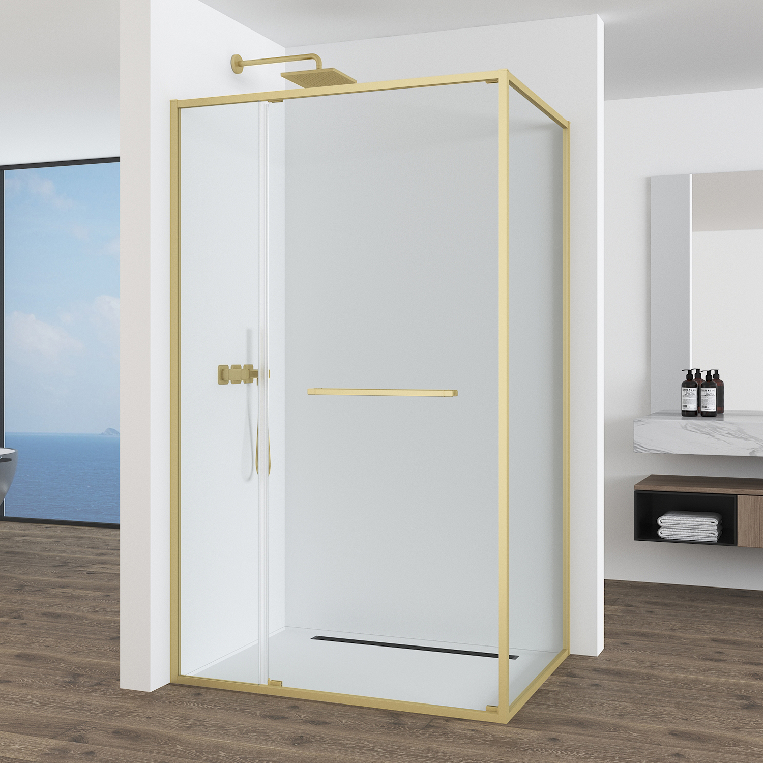 • Закаленное стекло• Цвет Brushed Gold, анодированный алюминиевый профиль