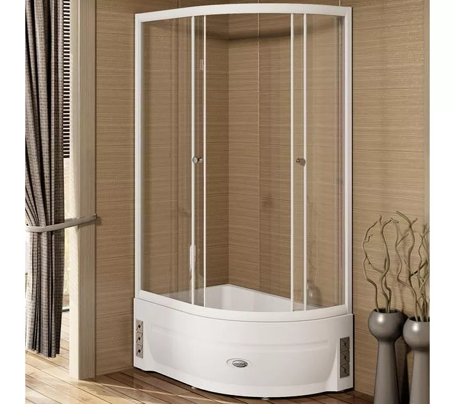 Душевой угол обладает классической белой расцветкой и радиальной формой поддона. Он великолепно сочетается с любым стилистическим решением санузла, гармонизирует пространство, не загромождая и не скрадывая полезную площадь.