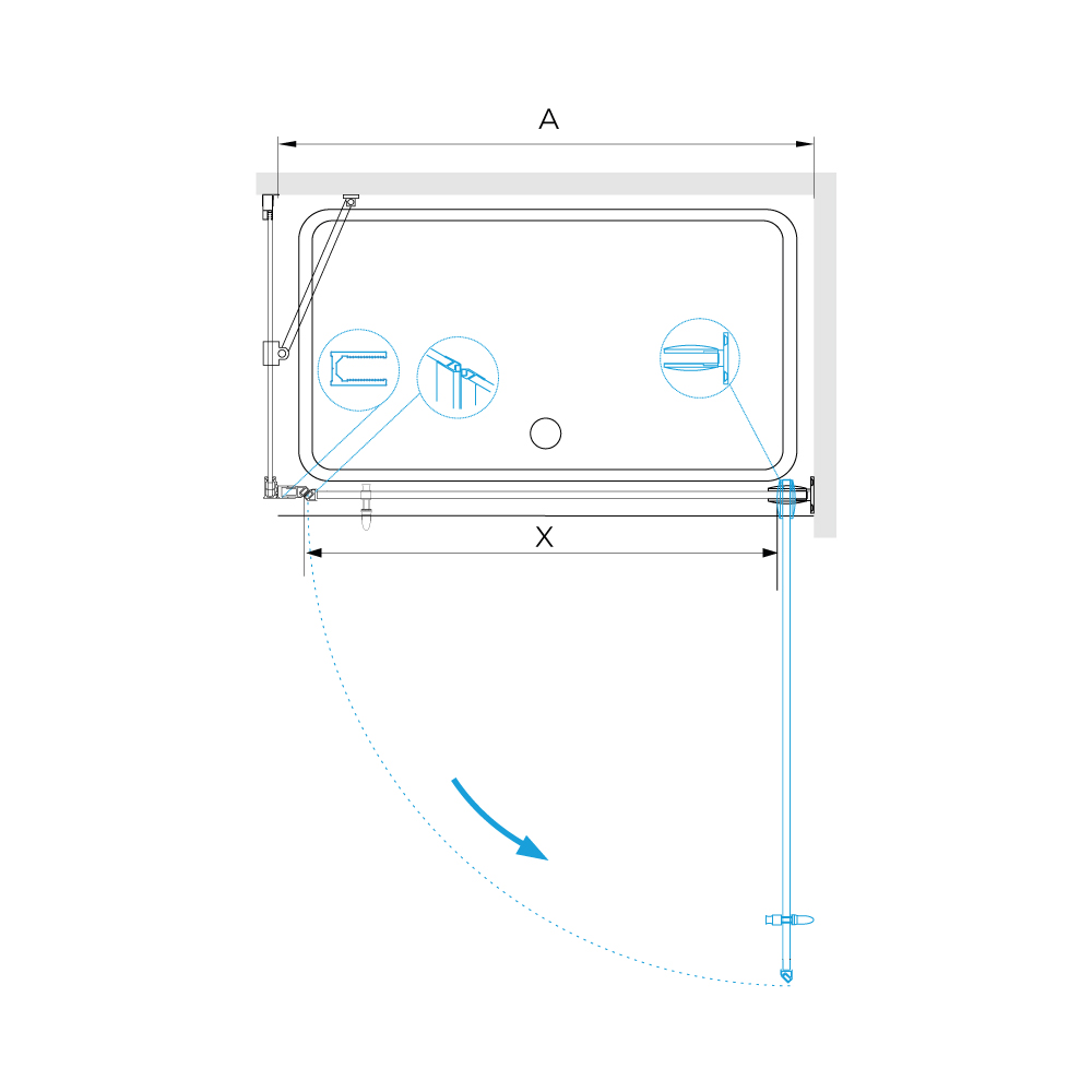 Душевой угол с распашной дверью распашная. В комплекте нижняя пороговая планка. Трап или поддон приобретается отдельно.