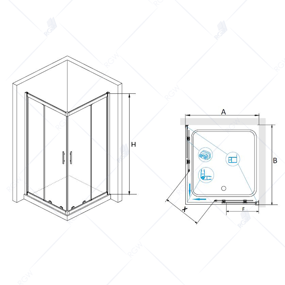 Душевой уголок квадратный, раздвижные двери из центра. Трап или поддон приобретается отдельно.