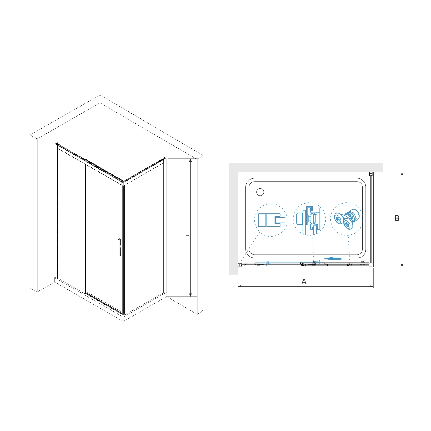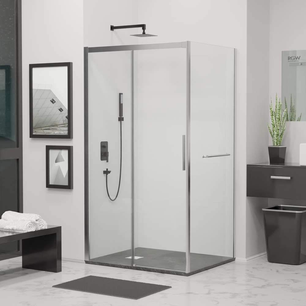 Душевой уголок с закаленным прозрачным стеклом 6 мм, с роликовым механизмом оснащенные автодоводчиком. Угол состоит из душевой двери RGW LE-12 и боковой панели RGW Z-060-2. Трап или поддон приобретается отдельно.