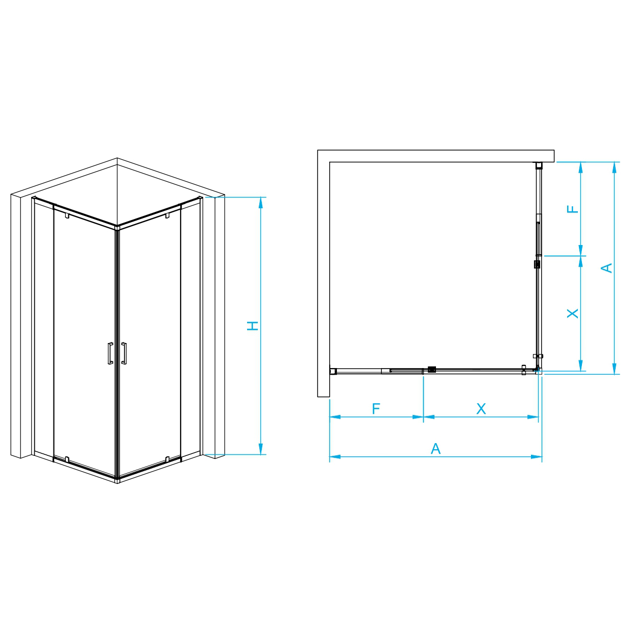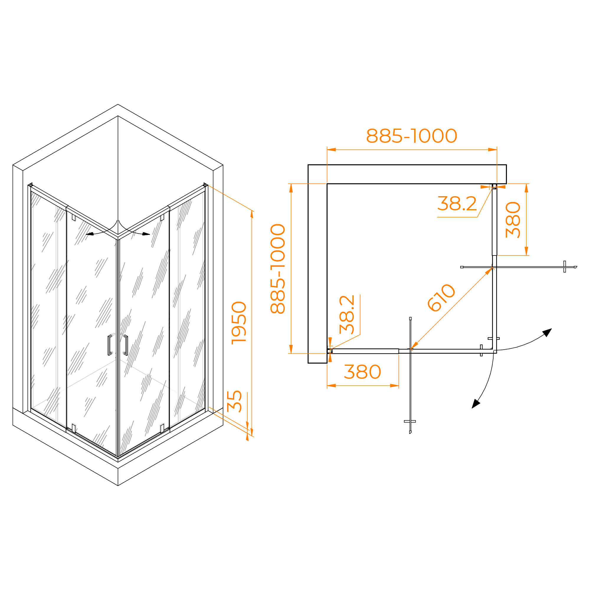 Душевой уголок квадратный с раздвижными профилями (ширина регулировки 10 см).