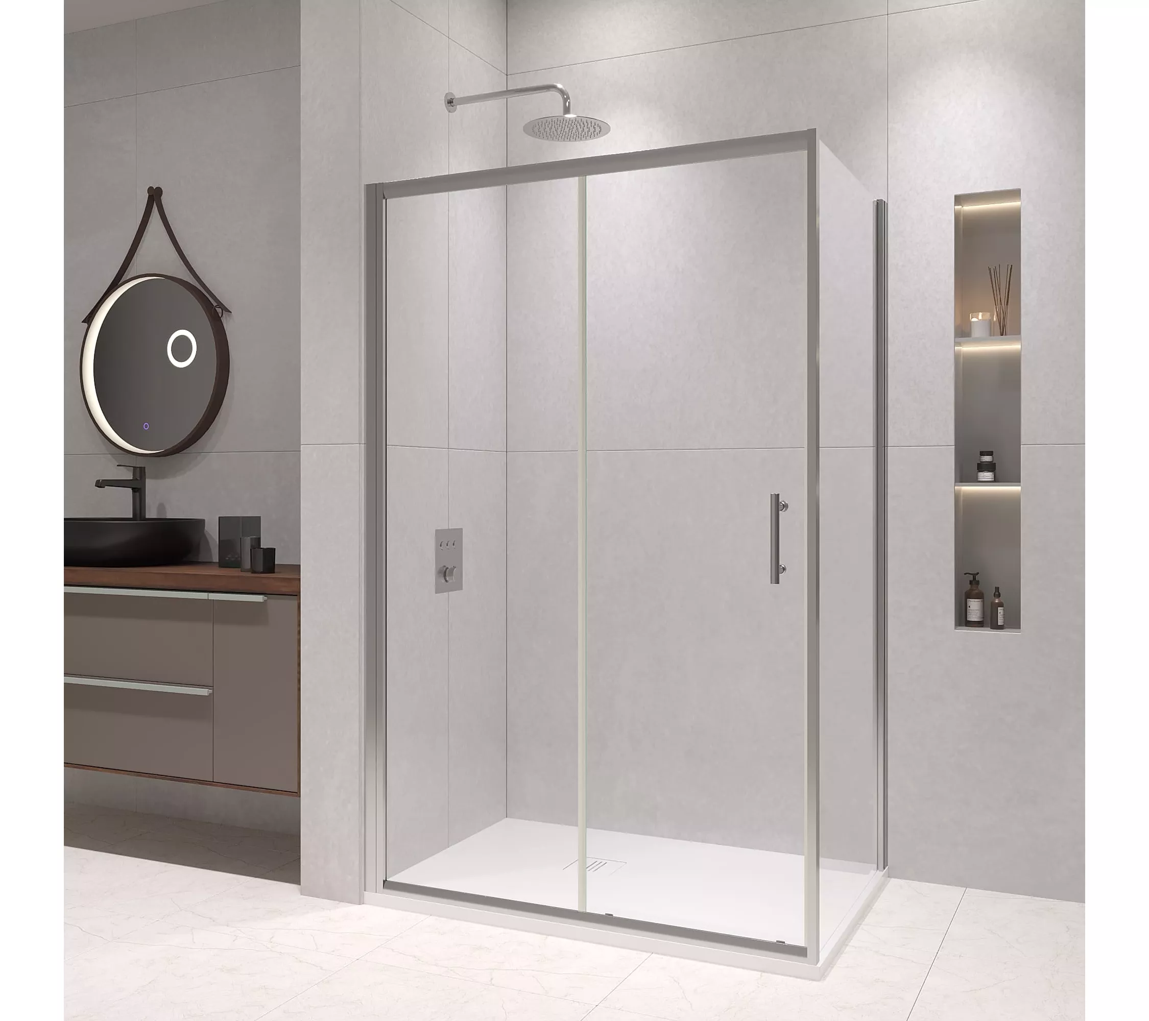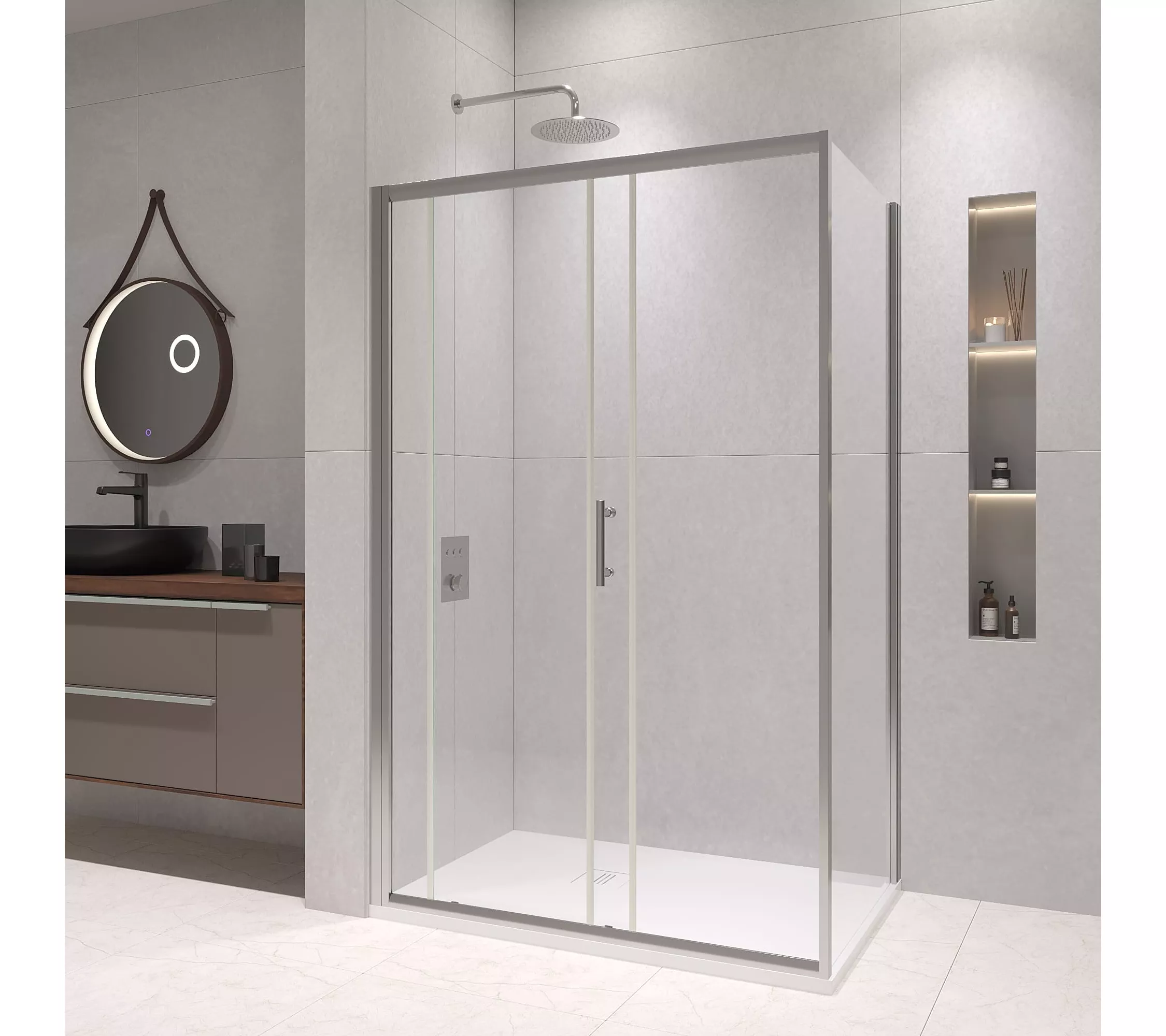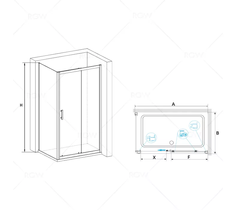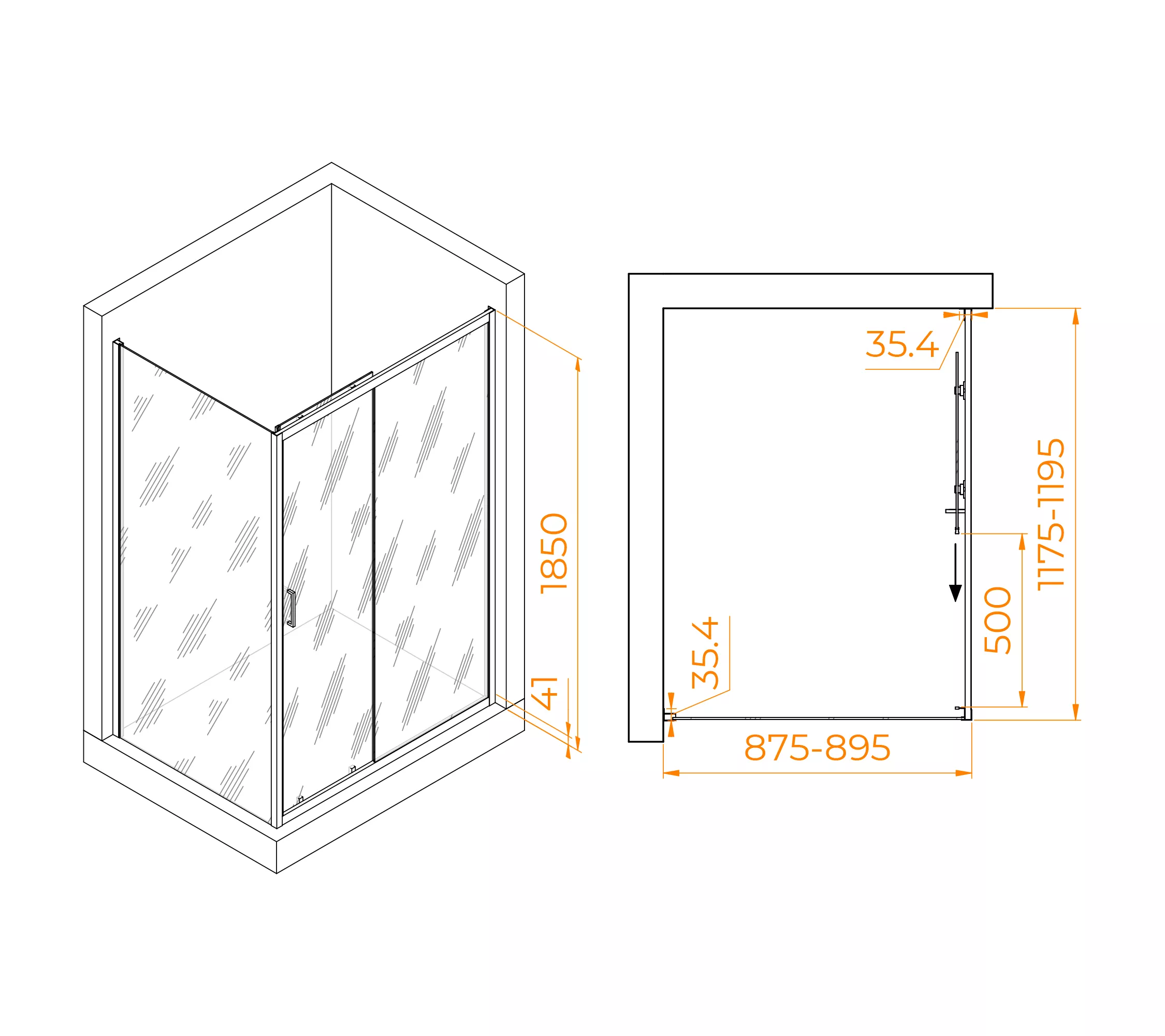 Душевой уголок прямоугольный, одна раздвижная дверь. Трап или поддон приобретается отдельно.