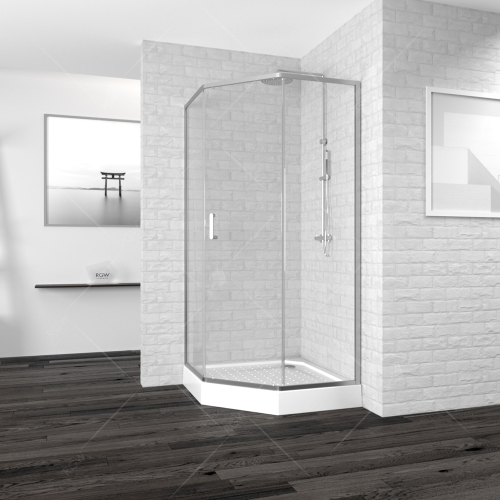 Душевой уголок трапеция со сдвижной дверью на роликах, хромированная цинковая ручка.